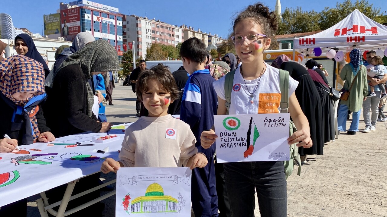 Kırşehir Kudüs Platformu ve Yetim Vakfı tarafından düzenlenen etkinlikte, Cacabey Meydanı'nda yere serilen metrelerce uzunluğundaki rulo kağıtlara çocuklar duygularını yazdı, resim çizip boyadı.