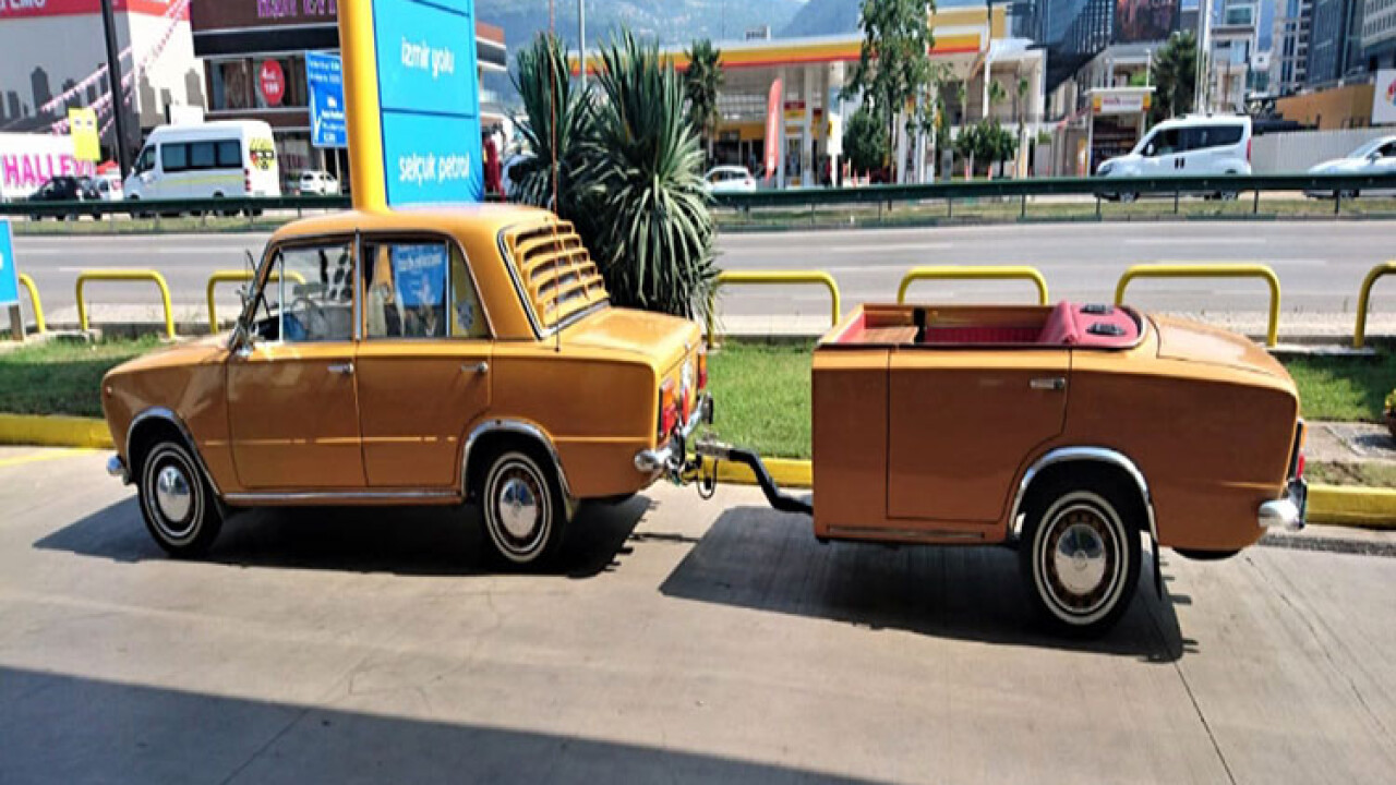 Yollarda modifiye edilmiş klasik otomobili ve arkasında aynı model ortadan ikiye kesilmiş römorku gören vatandaşlar gözlerini bu tasarım harikası otomobilden alamıyor.