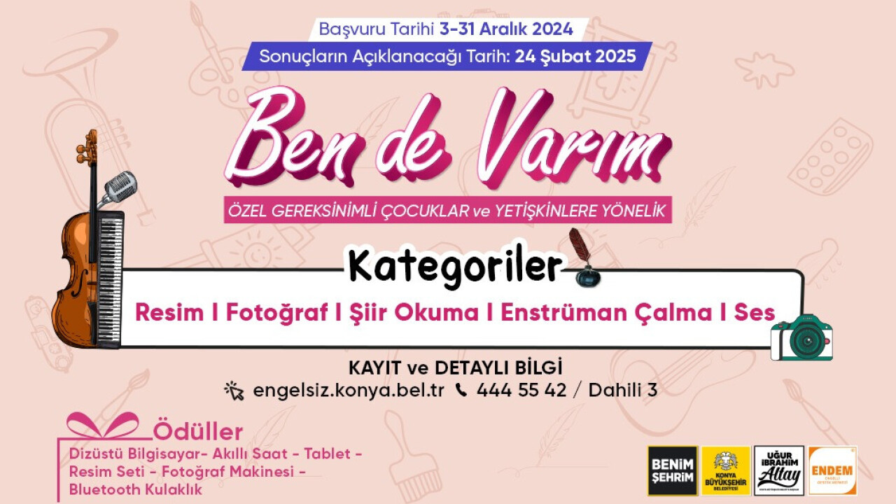 Konya Büyükşehir Belediyesi, 3 Aralık Dünya Engelliler Günü kapsamında “Ben de Varım” sloganıyla özel gereksinimli çocuklar ve yetişkinlere yönelik ödüllü yarışma düzenliyor.
