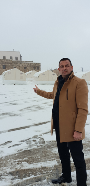Sonra Vali Yardımcımız Erkan Kaçmaz ile bir araya geldik. Valilik binasında da duvarlara baktığınızda depremin izlerini görmemeniz mümkün değil. Fotoğraf çekildiğimiz her bir bina içerisinde, arkamızda bir duva çatlağı görmeniz mümkün... İlerleyen saatlerde git gide hava soğu ve kar yağışı başladı. Hava çok soğuktu ve Kültür Park'ın içerisinde kurulan çadır kente gittik. Orada durum çok daha vahim. Emniyet güçlerimiz bile tenekelerde yaktıkları ateşte ısınmaya çalışıyor. Tırlarımız hala gelememişti. Kayseri yolunda kar yağışı git gide arttığı için polis tırlarımızı salmıyordu. Yol kapanmıştı çünkü. Çok geç gelen tırlarımızı Elazığ Belediyesi Yetkilileri teslim adlılar. Ve en çok bebek maması ve çocuk bezi ihtiyacı olduğunu söylediler. Kolilerimizin her birisinde ne olduğu yazdığı ve çok düzenli olduğu için de ayrıca tebrik aldık.