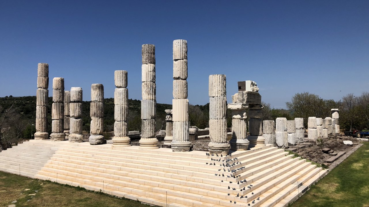 Tapınağı çevreleyen mermer sütunlardan her biri, üst üste konmuş yedi tamburdan oluşmakta. En üstte yer alan yedinci sütun tamburları kabartma bezemeler. Anadoluda nadir görülen bu figürlerle bezeli sütun tamburlarında boğa başı, çelenk süsleri, ve İlyada destanında anlatılan mitolojik sahneler betimlenmiş.