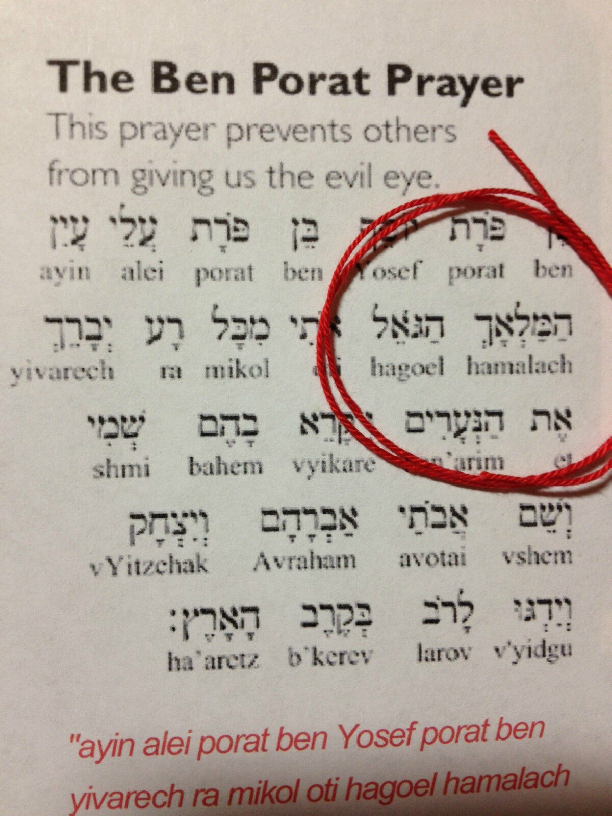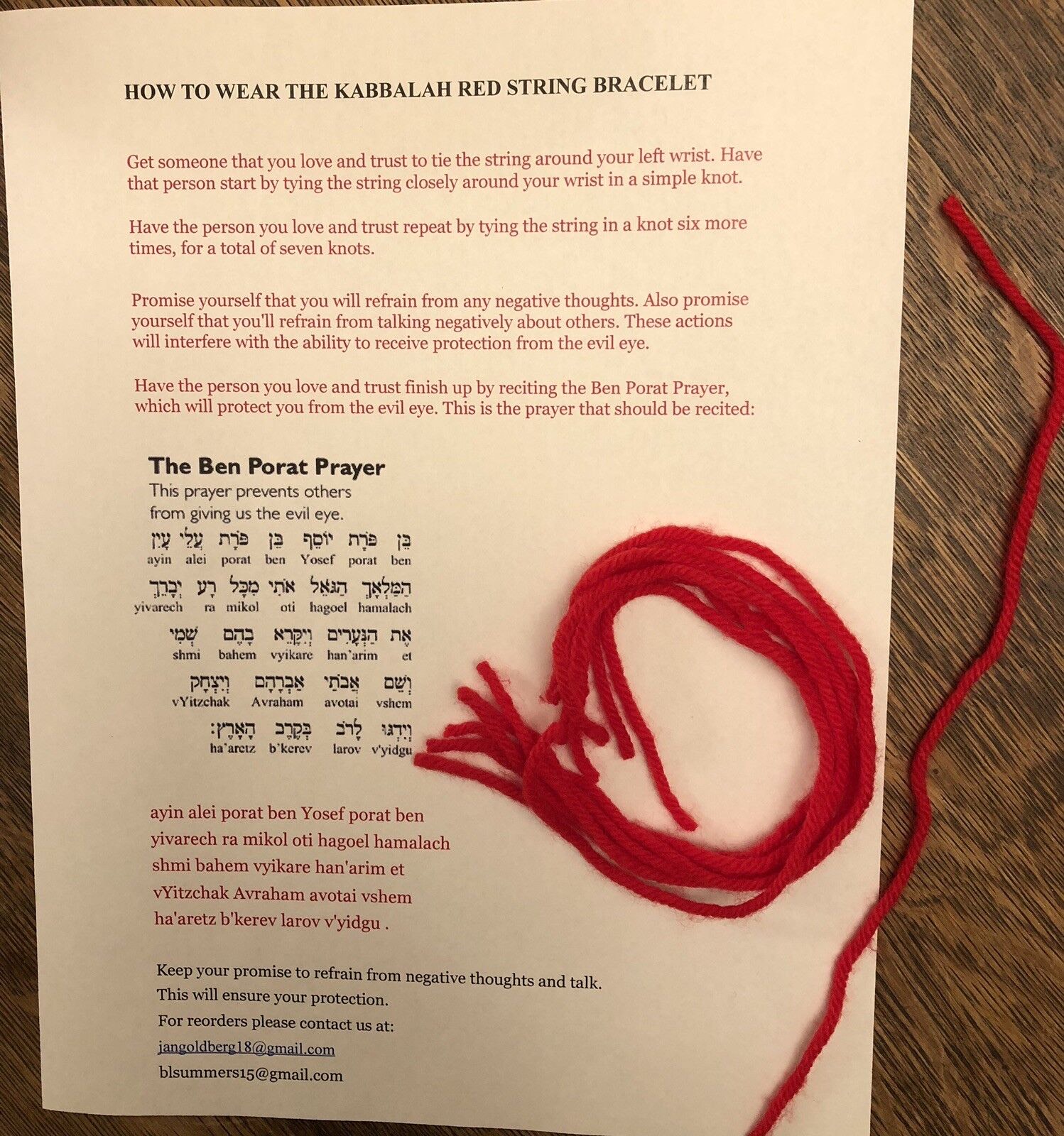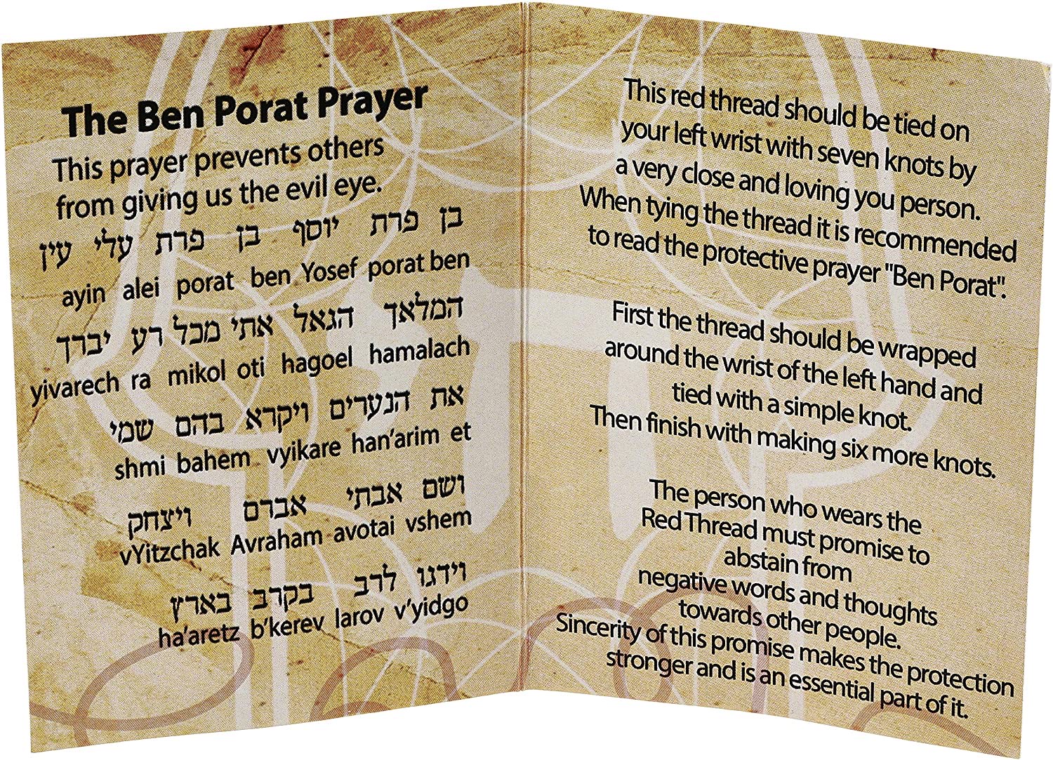 Bu satışlarda genellikle ipler paket içinde “Ben Porat” duası denen bir duayla birlikte geldi. EBay, Amazon, Ali express bile bileklikleri bu duayla birlikte yolladı… Ve bu okunarak takıldığında etkisinin arttığı, kem gözlerden koruduğu söylendi.