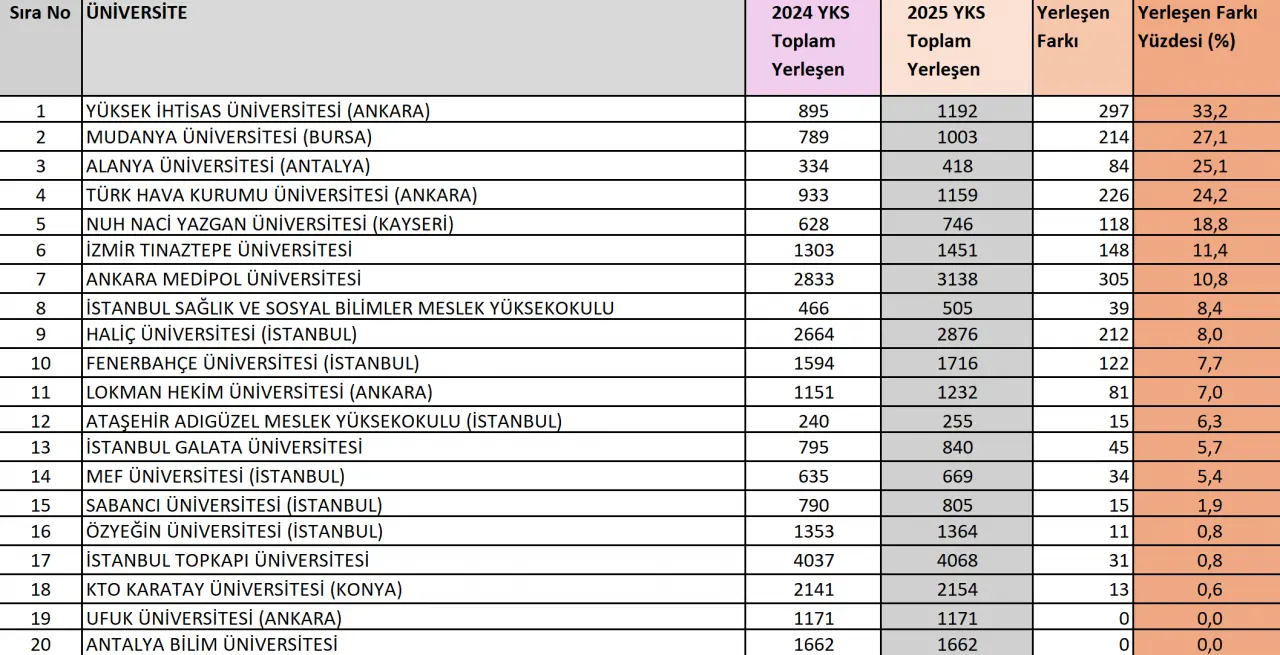 2025 yılında önceki yıla göre talebini en fazla arttıran yirmi üniversite içinde birinci sırada Ankara’daki Yüksek İhtisas Üniversitesi yer alıyor. Bu üniversitenin aldığı talep bu yıl yüzde 33,2 oranında artmış. İkinci sırada talebini yüzde 27,1 oranında arttıran Mudanya Üniversitesi, üçüncü sırada ise talebini yüzde 25,1 oranında arttıran Alanya Üniversitesi yer alıyor. Üçü de genç birer üniversite ve çok stratejik coğrafyalarda konumlanmış durumda.