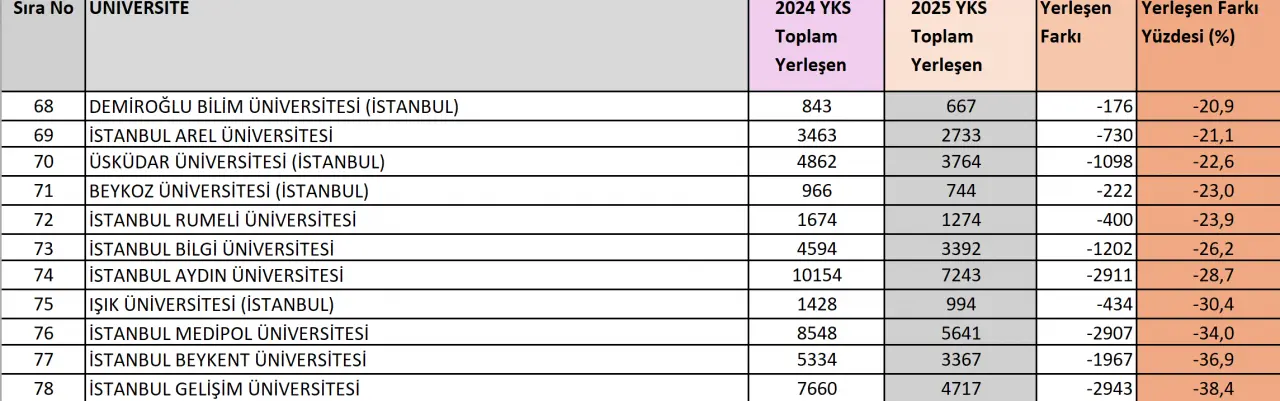 Yani 2024 yılında mesela 100 öğrenci tarafından tercih edilen bir üniversite 2025 yılında kaç öğrenci tarafından tercih edildi? 2024 yılında yüz öğrenci tarafından tercih edilen bir üniversite 2025 yılında yüz on öğrenci tarafından tercih ediliyorsa o zaman talebi yüzde on oranında artmıştır ama doksan öğrenci tarafından tercih ediliyorsa o zaman talebi yüzde on oranında düşmüştür. Bence talep değişim oranını anlatan bu istatistik çok önemli bir veri.