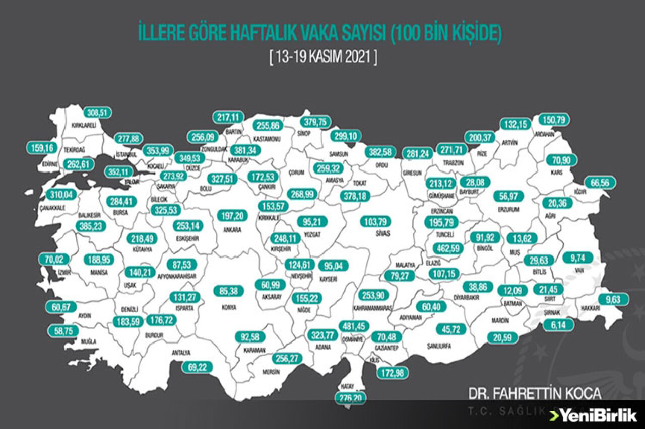 İllere göre 13-19 Kasım'da her 100 bin nüfusta görülen Kovid-19 vaka sayıları yüksekten düşüğe şöyle sıralandı: