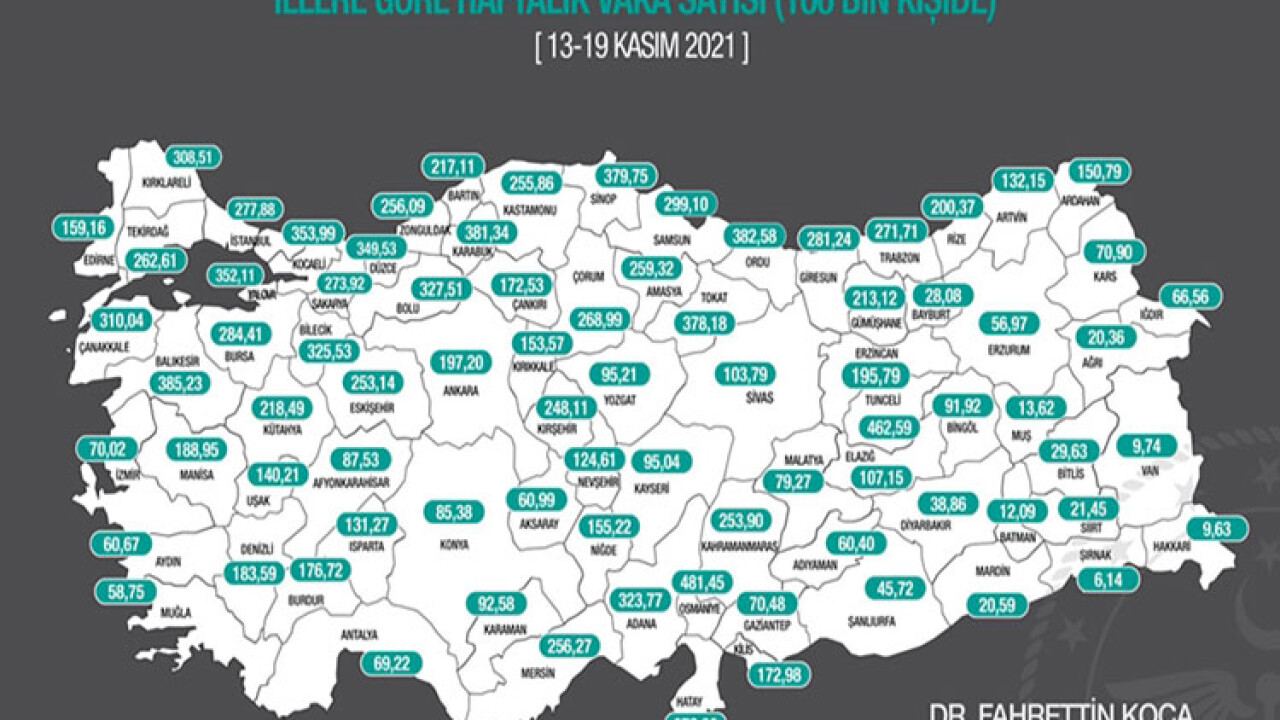 Bakan Koca, 13-19 Kasım arasında vaka yoğunluğu bir önceki haftaya göre en çok artan 10 ilin Tunceli, Adana, Gümüşhane, Mersin, Sinop, Hatay, Burdur, Kilis, Giresun, Mardin olduğunu bildirdi.