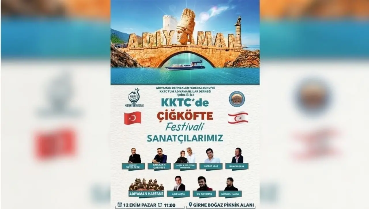 Adıyaman’ın zengin kültürel mirasını Kuzey Kıbrıs Türk Cumhuriyeti’nde tanıtmak amacıyla Adıyaman Dernekler Federasyonu ve KKTC Tüm Adıyamanlılar Derneği tarafından organize edilen “Kıbrıs’ta Kültür Festivali”, bölgedeki vatandaşlara kültür dolu bir gün yaşatmaya hazırlanıyor. Festival, 12 Ekim Pazar günü saat 11.00’de Girne Boğaz Piknik Alanı’nda başlayacak.