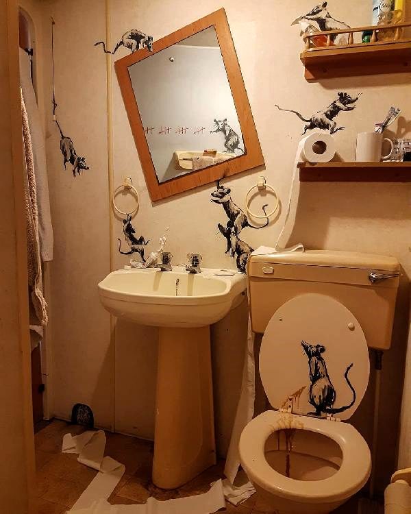 Sokak sanatının sembol isimlerinden biri olan Banksy, koronavirüs karantinası nedeniyle son eserini dört duvar arasında yaratmak durumunda kaldı. Instagram hesabından fotoğraf paylaşan Banksy'nin son eserinde bir grup farenin banyoda yarattığı karmaşa ve dağınıklık görülüyor. Eserde fareler aynayla ve tuvalet kağıtlarıyla oynuyor, diş macununu sıkıyor, bir tanesi de klozette 'işini görüyor'. Ünlü sanatçı, paylaşımına "Evden çalıştığım zaman eşim bundan nefret ediyor" notunu düştü.