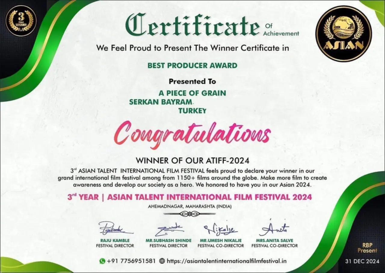 Serkan Bayram, sosyal medya hesabından bu başarıyı şu sözlerle paylaştı: "2025 yılının ilk büyük ödülü Buğday Tanesi'ne. Hindistan'da düzenlenen Uluslararası Asya Talent Film Festivali, 112 ülkenin ve 1150 filmin yarıştığı dev bir organizasyona sahne oldu. Amerika, İspanya, Almanya, Fransa, Avustralya gibi ülkeler, sinema dünyasının büyük sanatçılarıyla festivale katıldı. Bu gurur dolu platformda, Buğday Tanesi filmi 'En İyi Film' ödülüne layık görüldü. Buğday Tanesi olarak ülkemizi uluslararası arenada başarıyla temsil etmeye devam edeceğiz."
