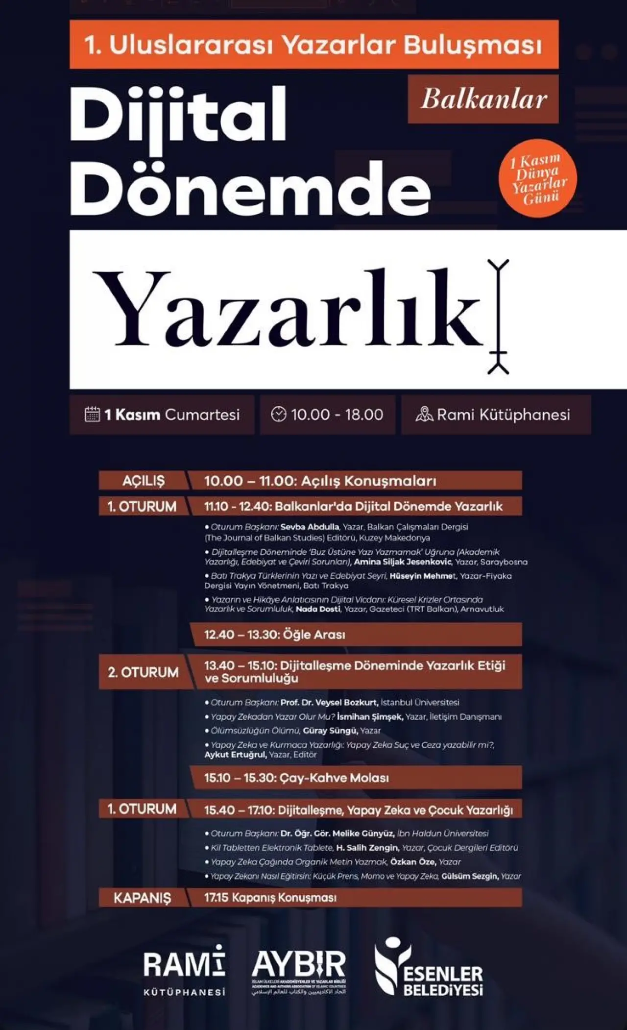 Esenler Belediyesi ve AYBİR iş birliğiyle düzenlenen 1. Uluslararası Yazarlar Buluşması, ücretsiz ve halka açık olacak. Dijitalleşen dünyada yazarlığın geleceğine ilgi duyan tüm kitapseverler ve profesyoneller Rami Kütüphanesi'ne davetli.