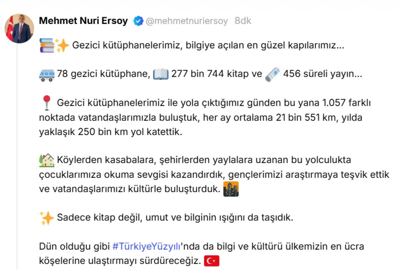 Ersoy, “Dün olduğu gibi #TürkiyeYüzyılı'nda da bilgi ve kültürü ülkemizin en ücra köşelerine ulaştırmayı sürdüreceğiz” dedi.