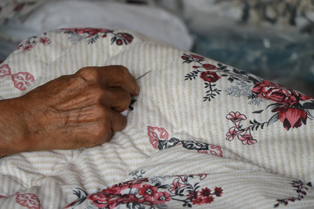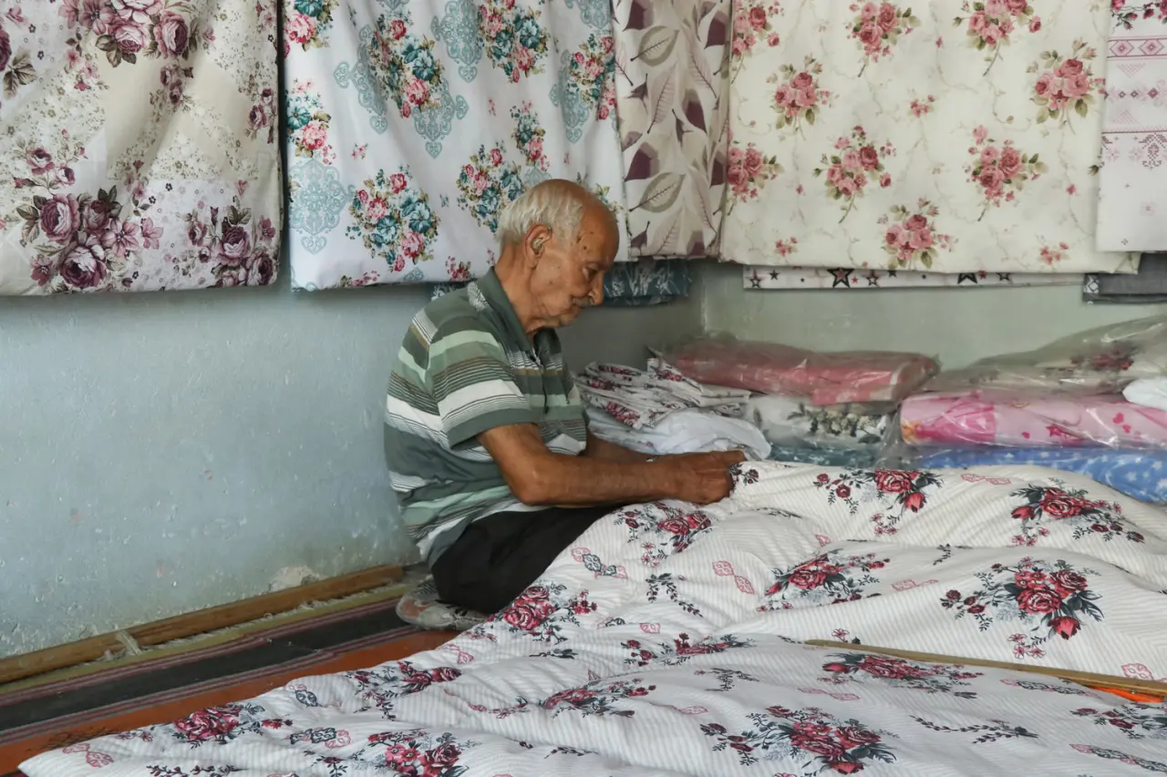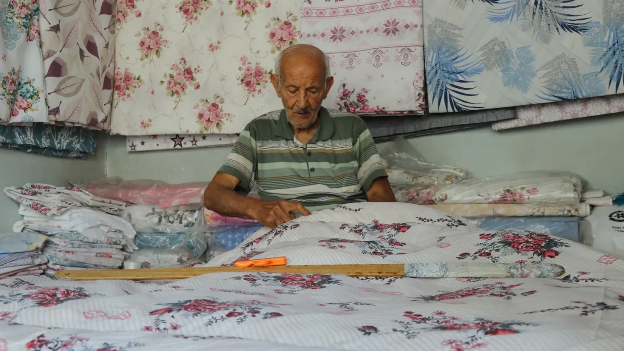 İğneyle ipliği ustalıkla yönlendiren parmakları, aynı zamanda yılların tanığı. Günde bir yorgan diken Türkyılmaz, dükkânında sadece iş değil, sohbet de üretmeye devam ediyor: “Evde duramam. Esnaflıktan geldik, burada oturur işimi yaparım, dostlarımla iki laf ederim.”