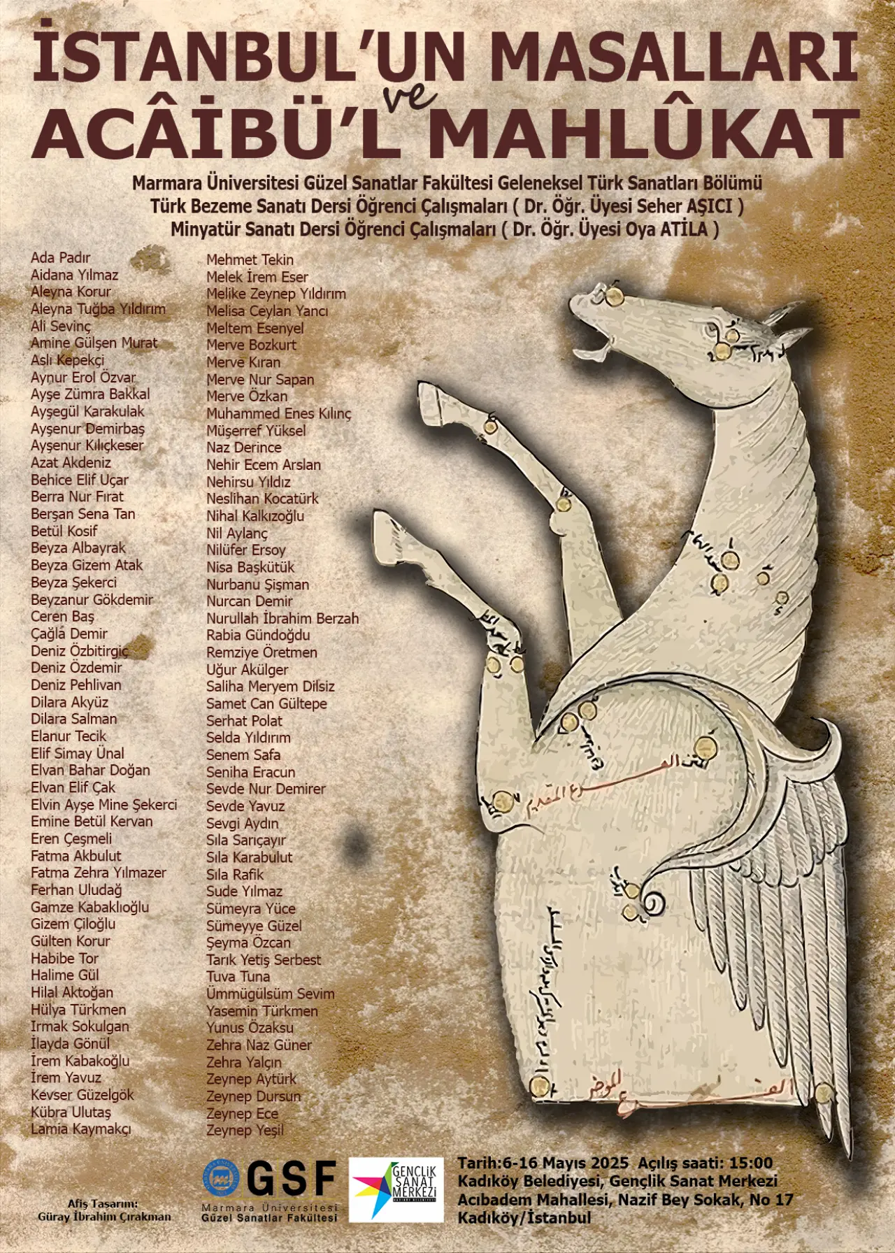 İstanbul’un kültürel ve sanatsal hafızasını genç sanatçılarla yeniden şekillendiren dikkat çekici bir etkinlik Kadıköy’de sanatseverlerle buluşuyor. Marmara Üniversitesi Güzel Sanatlar Fakültesi Geleneksel Türk Sanatları Bölümü öğrencileri, 6 Mayıs 2025 Salı günü saat 15.00’te Kadıköy Belediyesi Gençlik Sanat Merkezi’nde “İstanbul’un Masalları ve Acâibü’l Mahlûkat” adlı kapsamlı serginin açılışını gerçekleştirdi.