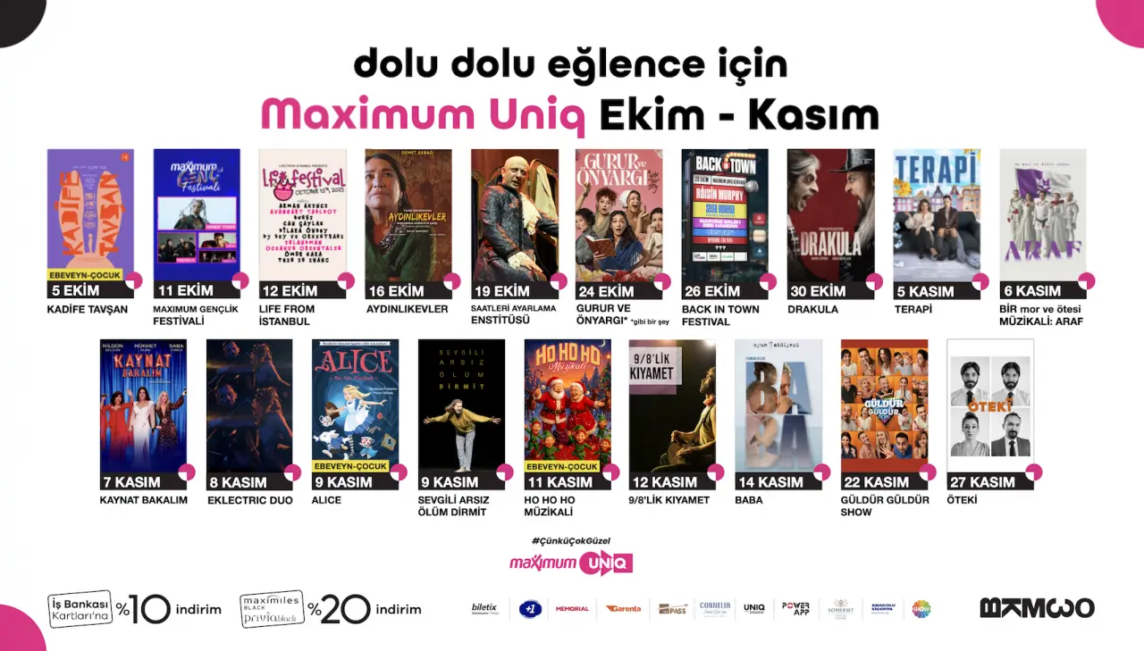 İstanbul'un kültürel yaşamının nabzını tutan, eğlencenin ve sanatın merkezi Maximum Uniq, Kasım ayında dopdolu bir programla sonbahara damgasını vuruyor. Maximum Uniq Hall ve Maximum Uniq Box sahnelerinde, tiyatro oyunlarından konserlere ve minik sanatseverler için özel çocuk oyunlarına kadar birbirinden keyifli etkinlikler tiyatroseverleri bekliyor.