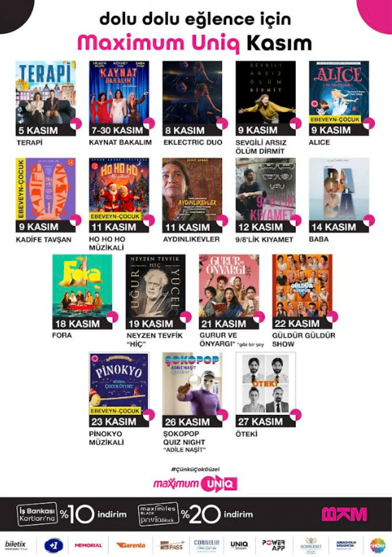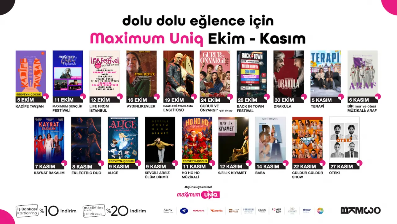 Kasım ayında Maximum Uniq Hall ve Maximum Uniq Box tiyatro oyunları, konser ve çocuk oyunlarıyla sonbahara giriyor.