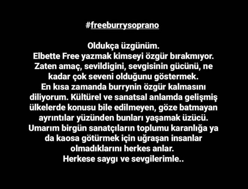 Paylaşımında Burry Soprano'nun en kısa zamanda serbest kalmasını dilediğini söyleyen rapçi Ceza, "Kültürel ve sanatsal anlamda gelişmiş ülkelerde konusu bile edilmeyen, göze batmayan ayrıntılar yüzünden bunları yaşamak üzücü. Umarım bir gün sanatçıların toplumu karanlığa ya da kaosa götürmek için uğraşan insanlar olmadıklarını herkes anlar. Herkese saygı ve sevgilerimle." diyerek paylaşımını noktaladı.