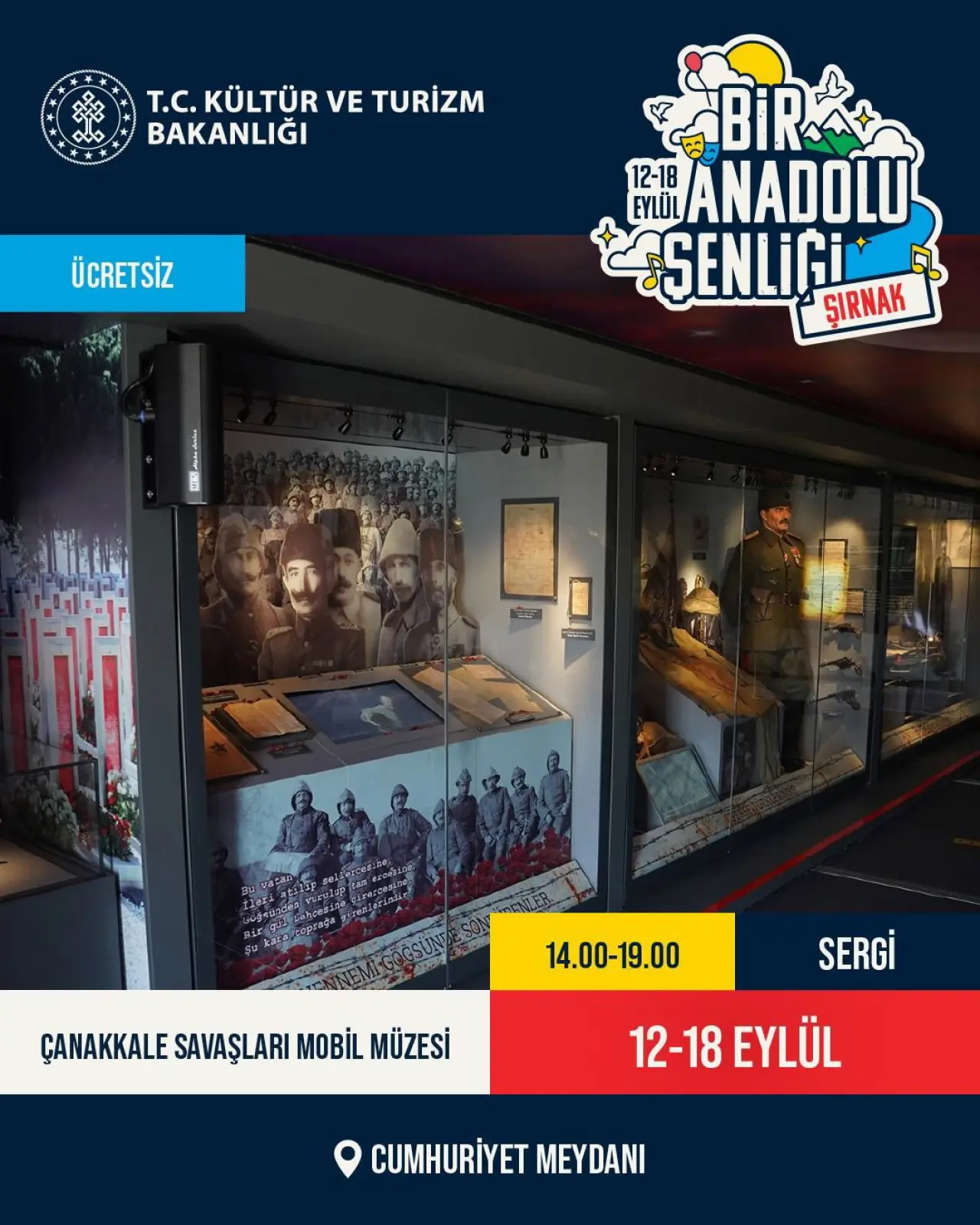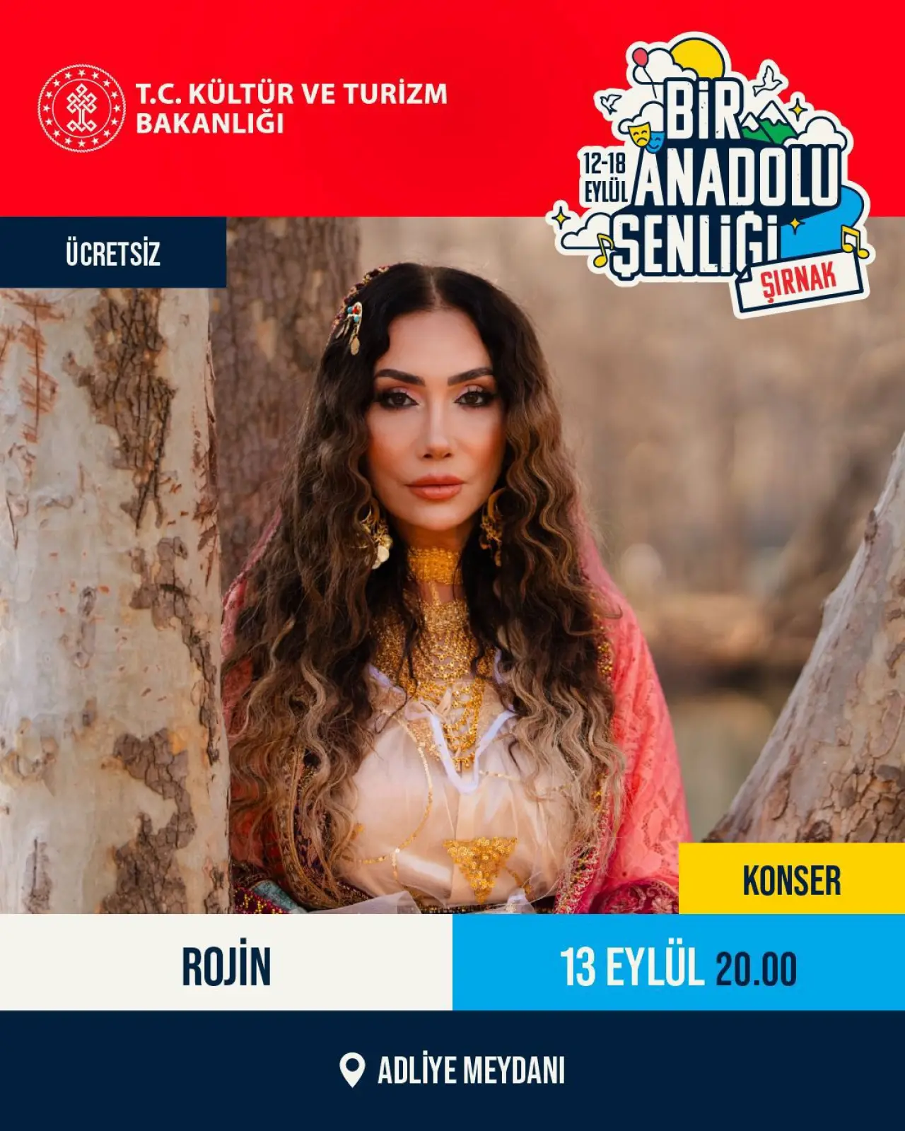 Kültür ve Turizm Bakanlığı’nın Yaşayan Miras ve Kültürel Etkinlikler Genel Müdürlüğü koordinasyonunda hayata geçirilen “Bir Anadolu Şenliği”, bu yıl Şırnak’ta kültür ve sanat dolu bir haftaya ev sahipliği yapacak. Program, huzur ve güven ortamında sosyal hayatın canlandığı Şırnak’ta, kadim kültürün izlerini günümüzle buluşturarak hem yerel değerlere sahip çıkmayı hem de kentin marka değerini yükseltmeyi amaçlıyor.