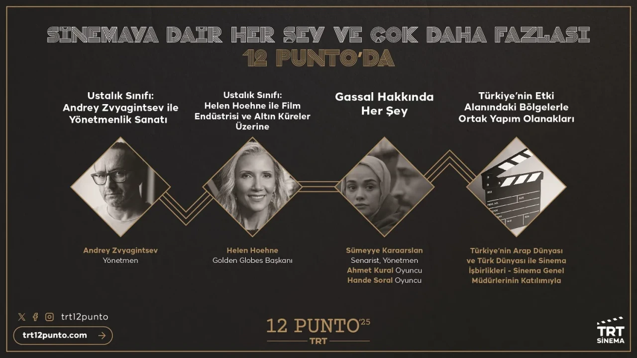12 Punto 2025 kapsamında Altın Küre Başkanı Helen Hoehne ve usta yönetmen Andrey Zvyagintsev, sinemaseverlere ilham verecek ustalık sınıfları düzenleyecek. Cannes, Fransa, Hollanda, Arap dünyası ve Türk Cumhuriyetleri'nden birçok sinema otoritesi ise ortak yapım olanaklarını değerlendirecek panellerde yer alacak.