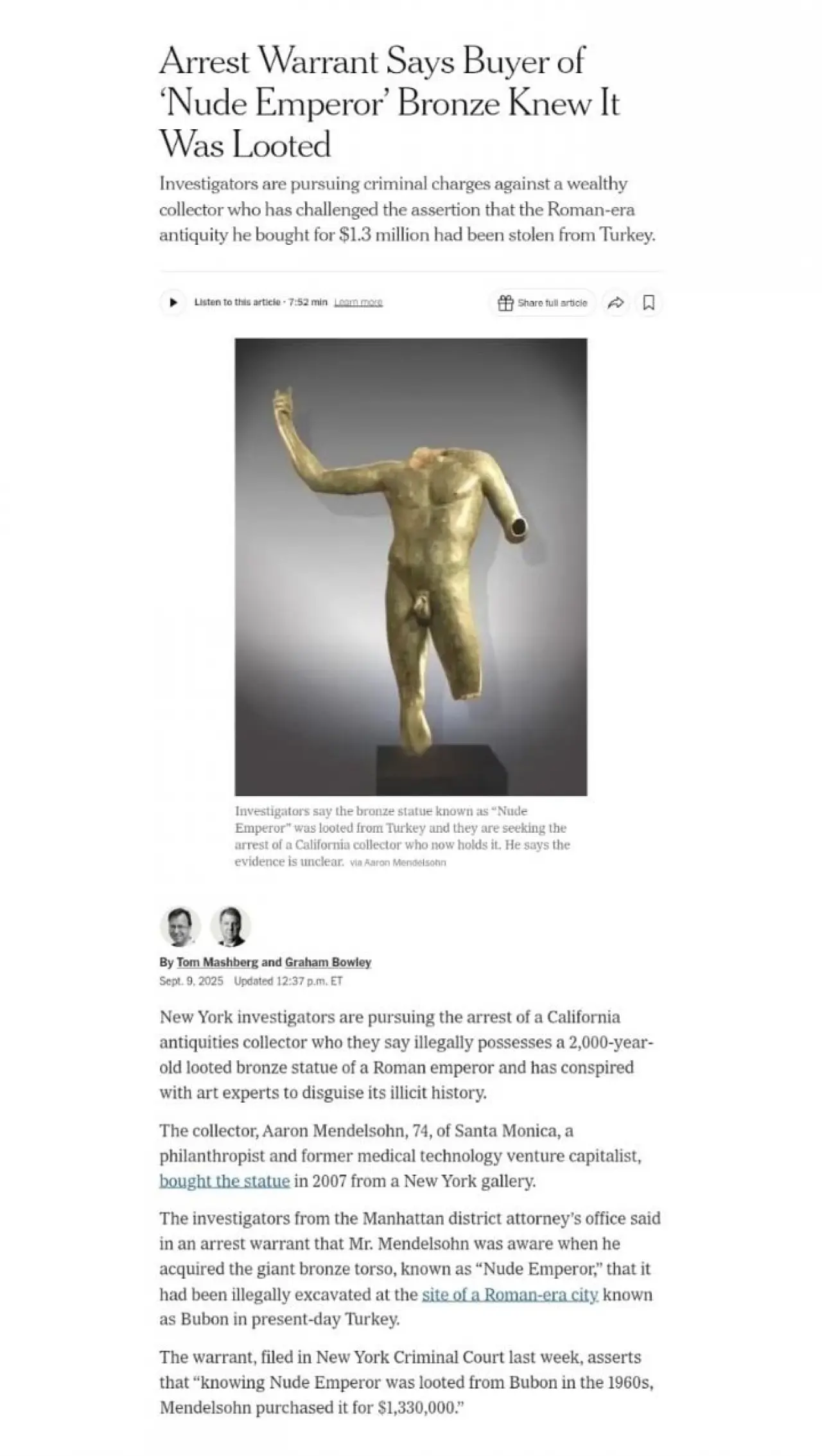 ABD'de 2017 yılında kurulan Çalıntı Eserler Birimi’nin yürüttüğü soruşturmada, Mendelsohn’un elektronik yazışmaları titizlikle incelendi. Delillere göre koleksiyoner, heykelin Türkiye’den kaçırıldığını biliyor ve bu durumu gizlemek için uzmanlardan hukuki tavsiyeler alıyordu. Eski bir müze küratörünün önerisiyle eseri yalnızca özel misafirlere göstermeye çalışan Mendelsohn’un bu çabaları sonuç vermedi.