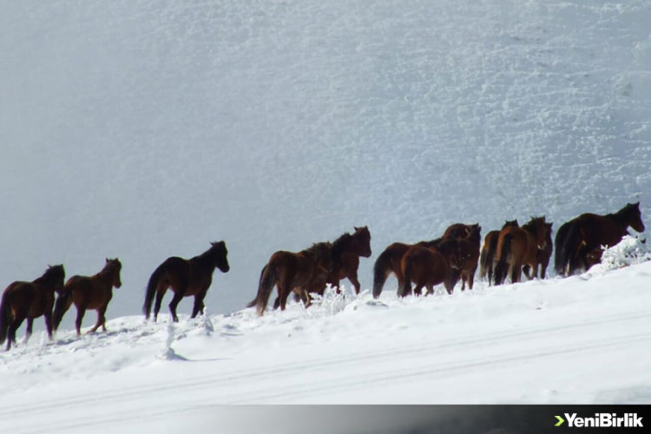 Ormanın iç kesimleri ile dağlarda yaşam alanı bulan ve sayıları tam bilinmeyen yılkı atları, 25-50'lik gruplar halinde, karla kaplanan bölgelerde yiyecek arıyor.