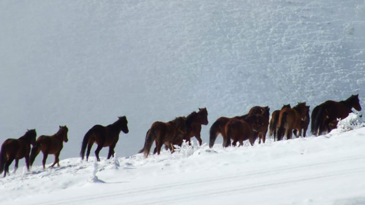 Beyaz örtü ve ağaçlar arasında bölgeye ayrı güzellik katan atların, buradan ayrılırken tek sıra halinde ilerleyişi görsel şölen sunuyor.