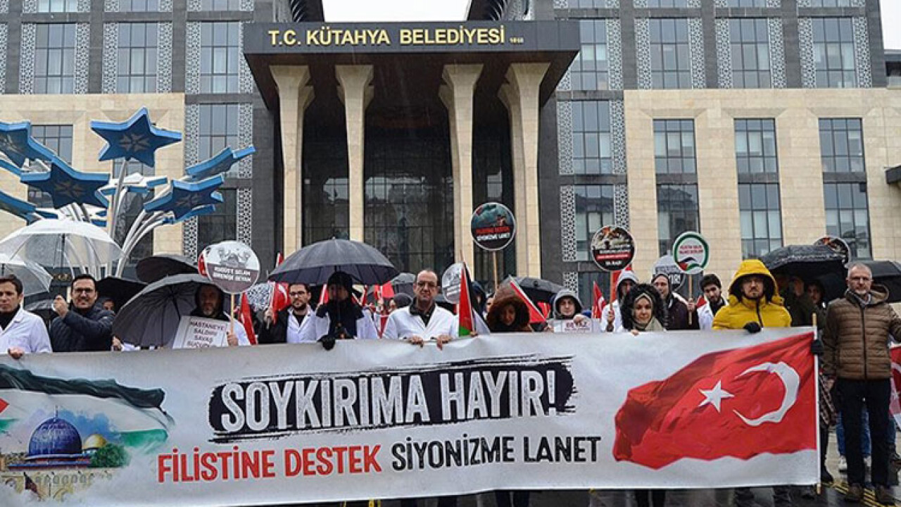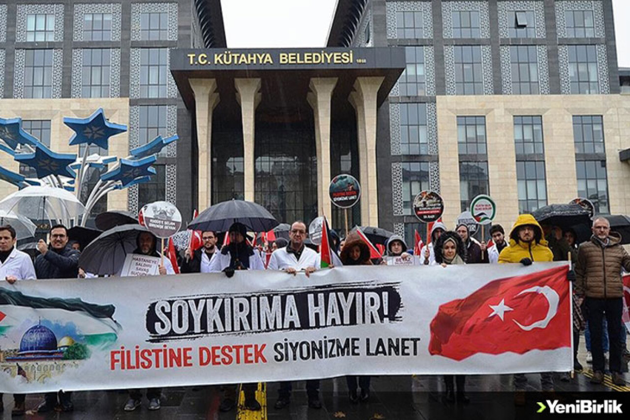 Kütahya Belediyesi hizmet binası önünde toplanan grup, "Soykırıma hayır, Filistin'e destek, siyonizme lanet" yazılı pankartla Atatürk Bulvarı'ndan Zafer Meydanı'na kadar yürüdü.
