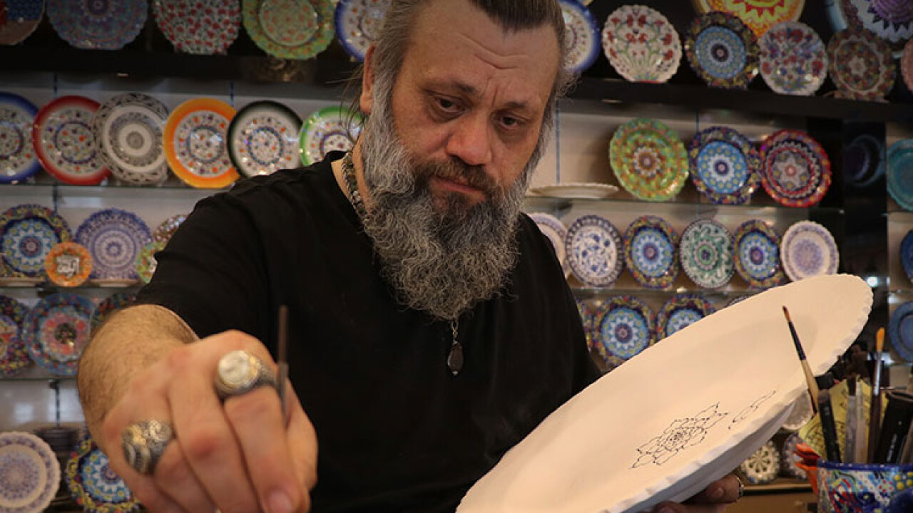 Kütahyalı geleneksel el sanatları ustası Mesut Gürbüz, çocukluğunda başladığını çini sanatını yaptığı sıra dışı çalışmalarla sürdürüyor.