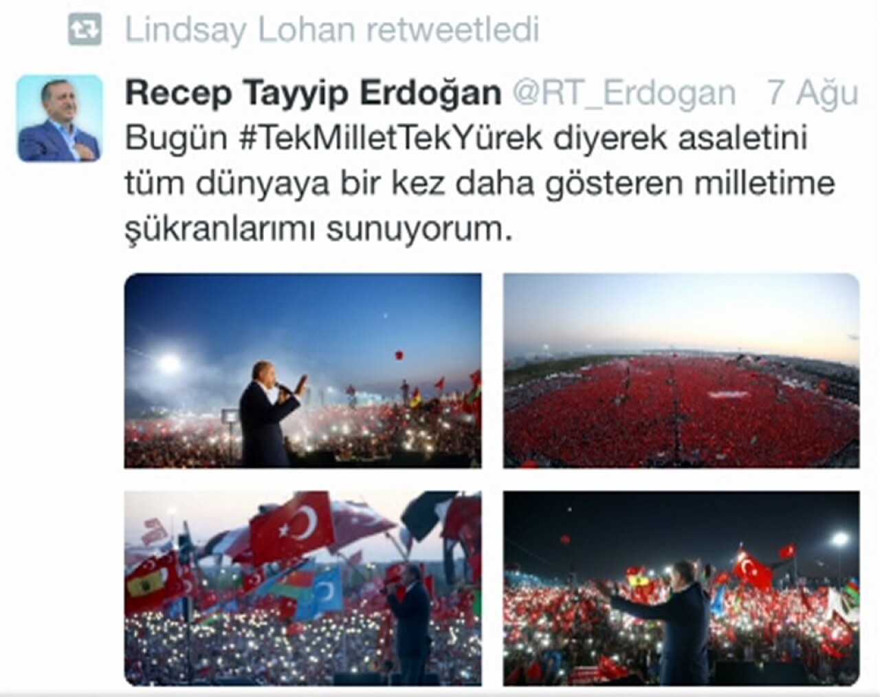 Ünlü Hollywood starı Lindsay Lohan sosyal paylaşım sitesi üzerinden yaptığı Türkiye paylaşımları yine çok konuşuldu. Lohan, Twitter üzerinden yeni ABD Başkanı Trump’a seslenerek, "Çünkü Yeni amerikan başkanımız var. Acı içindeki Suriyelileri ve Türkiye’nin onlara ne kadar yardım ettiğini unutmayalım. Bunu düzeltmeliyiz." ifadelerini kullandı. Lohan ayrıca Cumhurbaşkanı Erdoğan’ın 7 Ağustos’ta gerçekleştirilen Yenikapı Demokrasi ve Şehitler Mitingi ile ilgili, "Bugün #TekMilletTekYürek diyerek asaletini tüm dünyaya bir kez daha gösteren milletime şükranlarımı sunuyorum." tweetini ve fotoğraflarını retweetledi. Lindsay Lohan, ayrıca bir başka tweetinde ‘Suriyeli mülteciler için bir etkinlik düzenleyelim ve bağış için araba satalım. Belki Erdoğan ya da Putin bize yardımcı olur’ ifadelerini kullandı.