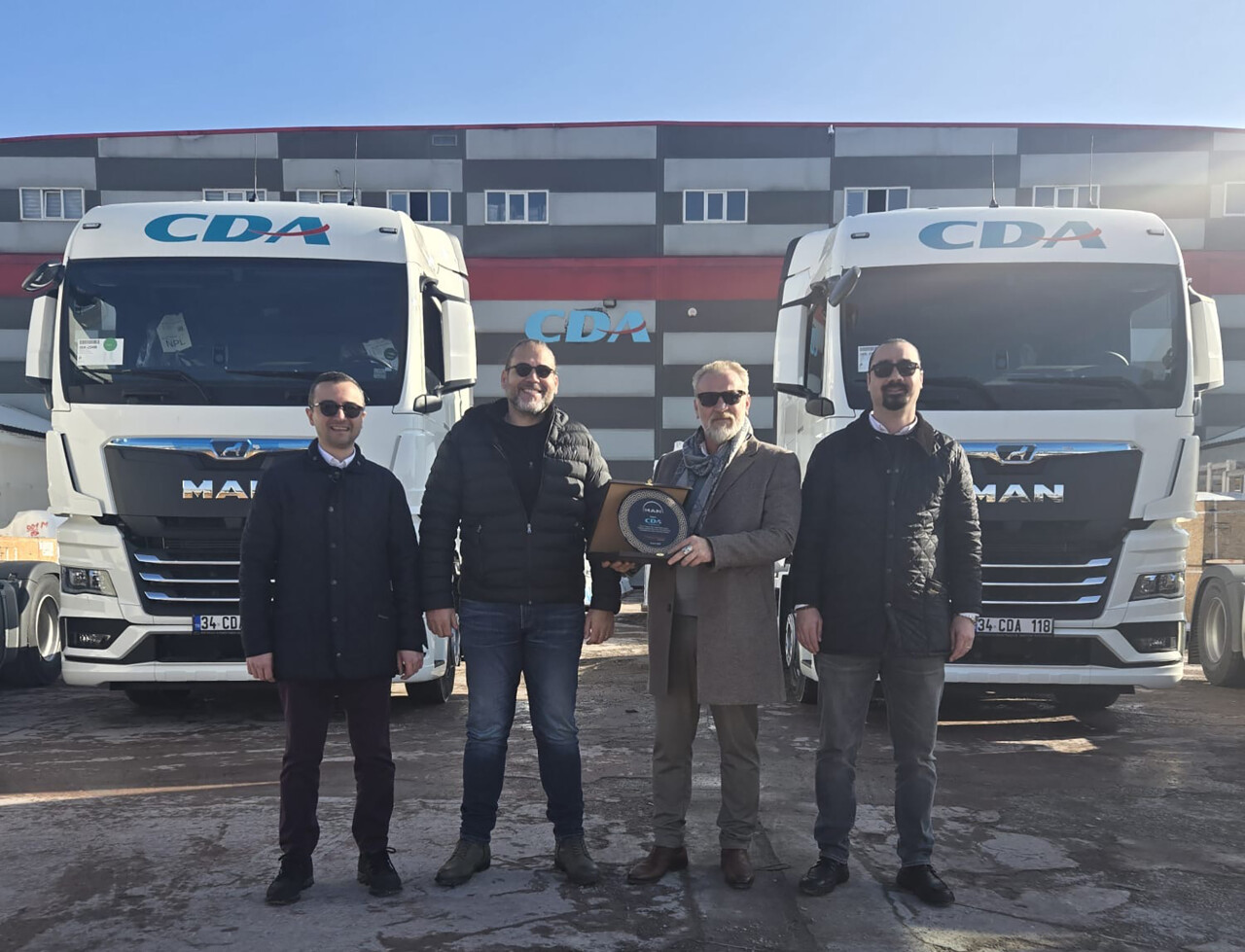 CDA Lojistik’in Tuzla Orhanlı’daki gümrüklü antreposunda düzenlenen teslimat törenine firma sahibi Cem Sular’ın yanı sıra MAN Kamyon ve Otobüs Ticaret A.Ş. Kamyon Bölge Satış Koordinatörü Özgür Tutumlu, Kamyon Satış Uzmanı Mete Geçör ve Trakman MAN Bayii Bölge Satış Yöneticisi Adnan Sarıyer katıldı.
