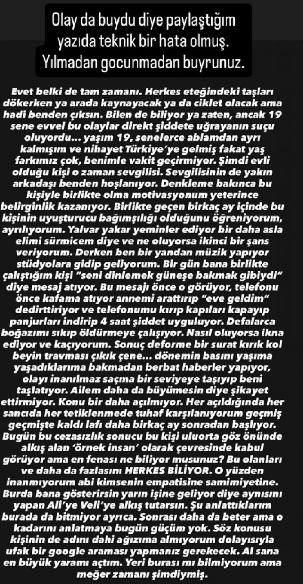 Ünlü isim, o dönem ailesinin konunun daha da büyümemesi için şikâyetçi olmasına izin vermediğini belirterek, “Cezasızlık sonucu bu kişi hâlâ çevresinde alkış alan bir insan olarak yaşıyor. En acısı ise herkesin bunları bilmesine rağmen sessiz kalması” sözleriyle sitem etti.
