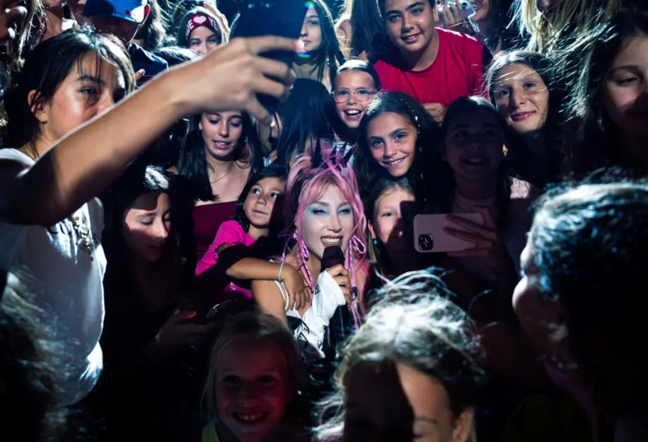 Konser boyunca enerjisini seyirciye yansıtan sanatçı, dikkat çekici sahne kostümüyle de geceye damga vurdu. Pembe saçları, devasa siyah kemerli botları ve iddialı aksesuarlarıyla kendine has tarzını bir kez daha ortaya koydu.