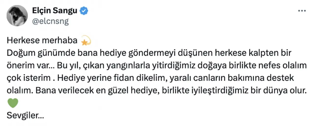 40 yaşına giren Elçin Sangu, doğum günü için hediye almak isteyenlere alışılmışın dışında bir öneride bulundu. Sosyal medyada yaptığı paylaşımda, Türkiye'de devam eden orman yangınlarına dikkat çekti: