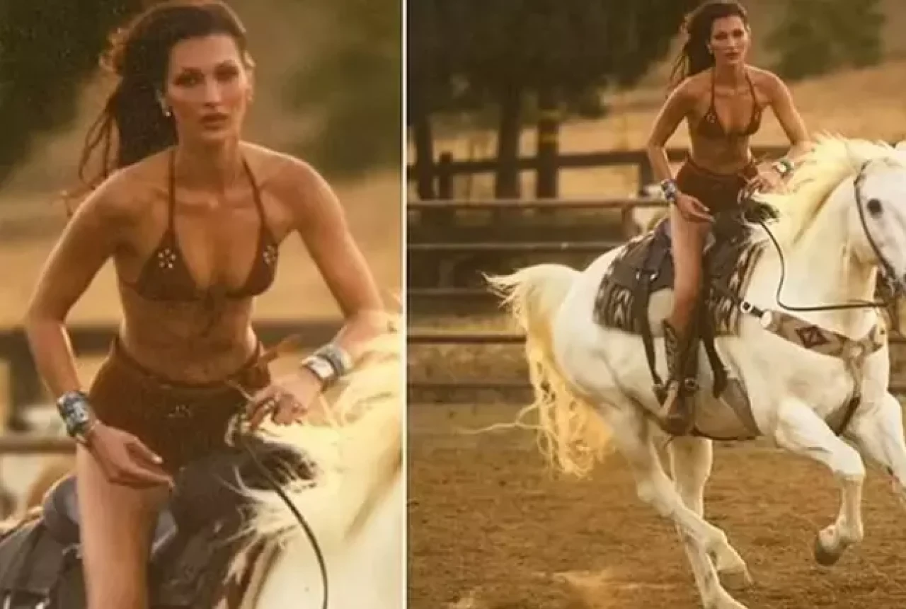 Bella Hadid, at binmeye olan tutkusunu moda ile birleştirdiği yeni fotoğraf çekimiyle takipçilerinin karşısına çıktı. Kahverengi üçgen bikini üstü ve uyumlu mini şortuyla bir at çiftliğinde objektif karşısına geçen ünlü model, tarzıyla büyük beğeni topladı.