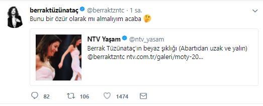 Tepkilerin ardından NTV Yaşam tweet'i silerken, Berrak Tüzünataç, skandal mesajı "Basınımızda böyle bir üslup oldukça, başka bir tacizciye ihtiyacımız yok. Üslupla ilgili uyaran her cevap için teşekkürler, iyi ki varsınız" ifadeleriyle paylaştı.