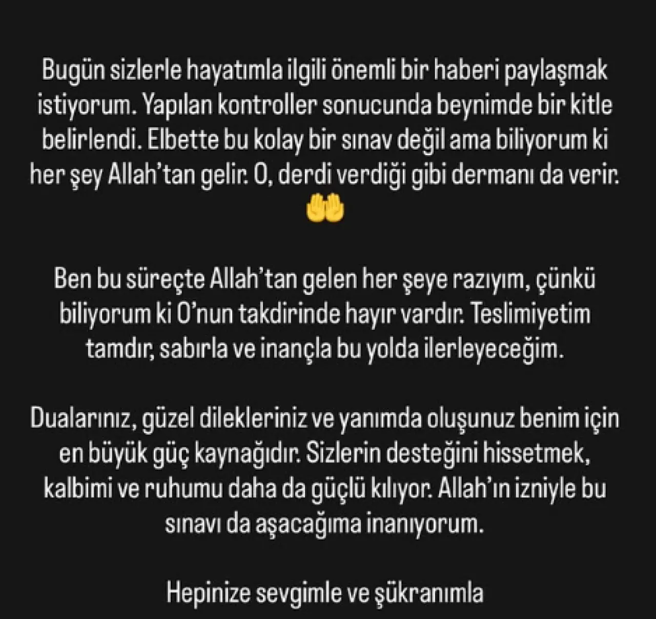 “Bugün sizlerle hayatımla ilgili önemli bir haberi paylaşmak istiyorum. Yapılan kontroller sonucunda beynimde bir kitle belirlendi. Elbette bu kolay bir sınav değil ama biliyorum ki her şey Allah'tan gelir. O, derdi verdiği gibi dermanı da verir.”