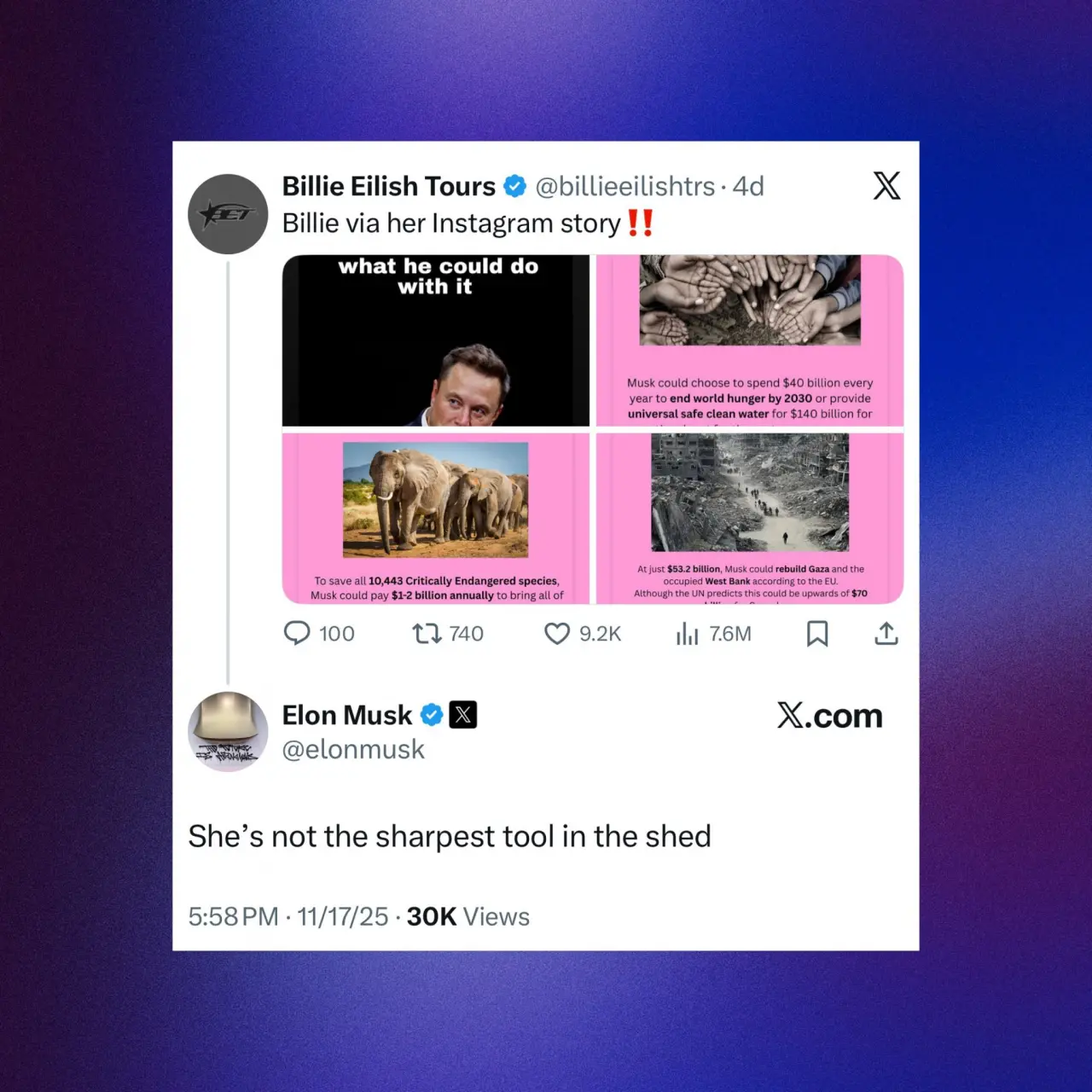 Görselde “Billie Eilish Tours” isimli X hesabından yapılan paylaşım ve Elon Musk'ın bu gönderiye yaptığı yanıt yer alıyor. Paylaşılan gönderide Billie Eilish'in instagram hesabı üzerinden yaptığı story paylaşımları yer alıyor. Bu paylaşımlarda Eilish, Elon Musk'ın dünyanın ilk trilyoneri olduğunu ve “bununla (bu parayla) neler yapabilirdi?” başlıklı ilk paylaşımıyla gelir adaletsizliğine dikkat çekiyor. Billie Eilish verdiği örneklerle Elon Musk'ın serveti; küresel temiz suya erişim, dünyada açlık, Gazze'nin yeniden inşa edilmesi gibi küresel sorunlara çare olabileceği ancak bunu tercih etmediğini söylüyor. Elon Musk ise buna karşın Eilish için “Parlak bir zekaya sahip olduğu söylenemez” ifadesiyle yanıt verse de birçok kişi için bu yanıt yetersiz ve açıklayıcı olmamakla suçlandı.