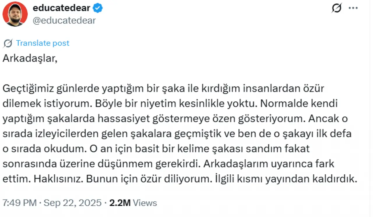 “Geçtiğimiz günlerde yaptığım bir şakayla kırdığım herkesten özür dilerim. Niyetim kesinlikle böyle bir şey değildi. O sırada izleyicilerden gelen şakaları okurken yanlış bir ifade kullandım. Sonradan hatamı fark ettim. Haklısınız. İlgili kısmı yayından kaldırdık.”