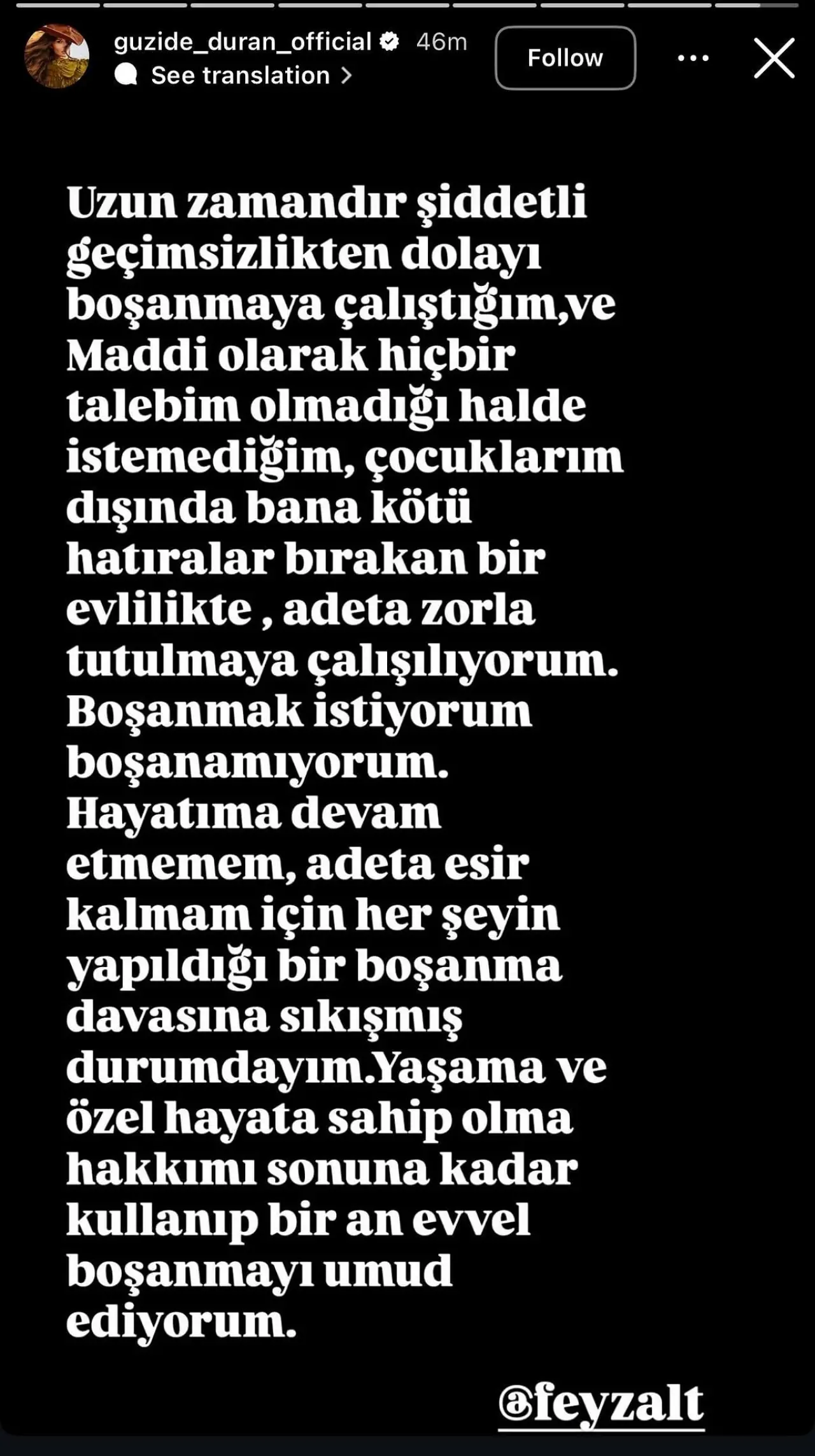 “Uzun zamandır şiddetli geçimsizlikten dolayı boşanmaya çalıştığım, çocuklarım dışında bana hiçbir şey kazandırmamış bir evlilikte adeta esir tutuluyorum. Hayatıma devam etmemem için her şey yapılıyor. Özel hayatıma sahip çıkmak en doğal hakkım.”