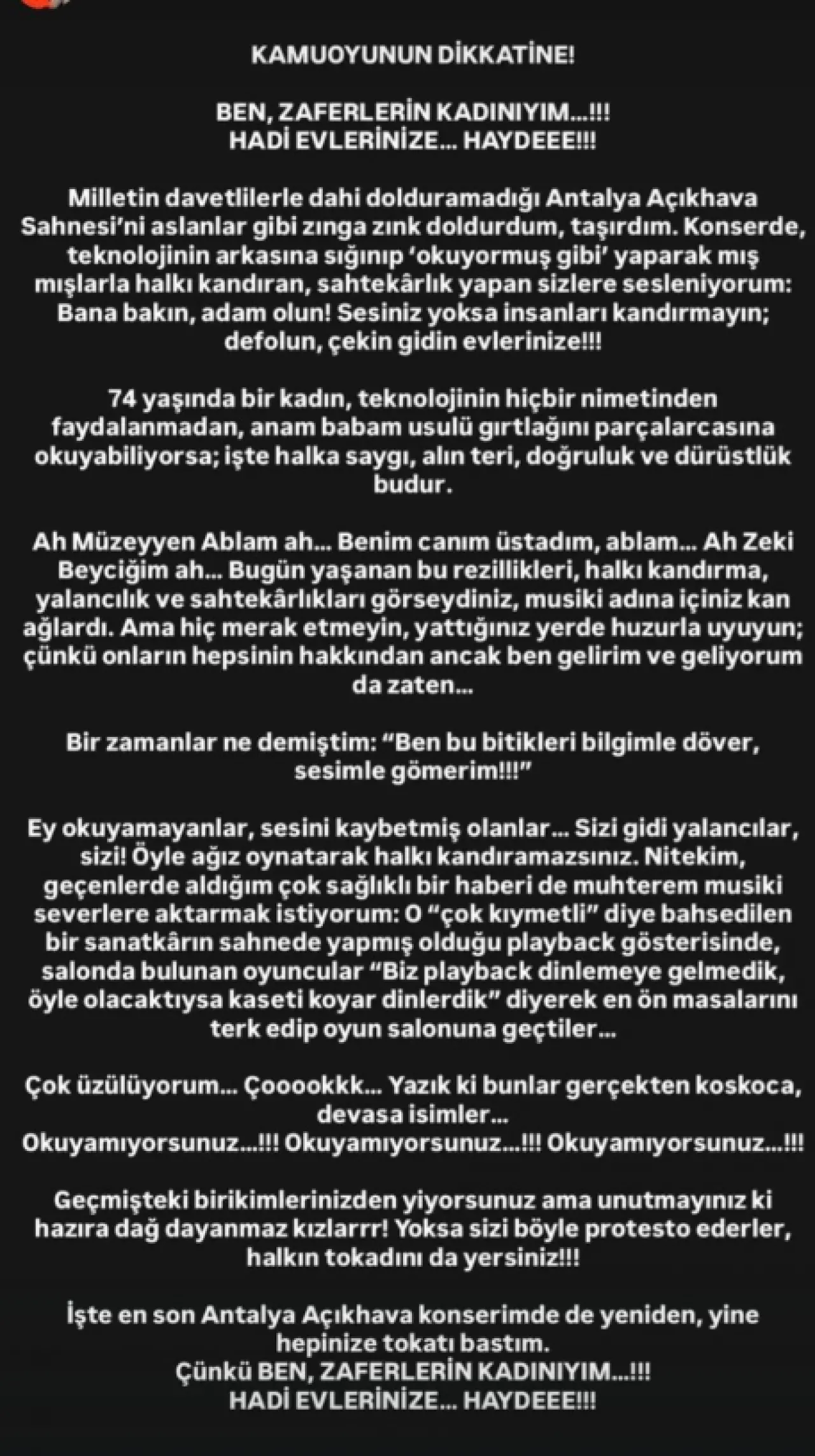 Türk müziğinin “Diva”sı Bülent Ersoy, sahte performans sergileyen sanatçılara adeta savaş açtı. Antalya Açıkhava konserinde tüm şarkılarını canlı söyleyen ünlü sanatçı, sosyal medya hesabından yaptığı uzun paylaşımda playback yapan meslektaşlarını hedef aldı.