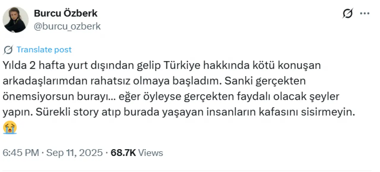 Oyuncu Burcu Özberk, sosyal medyada yaptığı paylaşımda yurt dışında yaşayan bazı arkadaşlarına sert bir sitemde bulundu. Yılda sadece birkaç hafta Türkiye’ye gelen ama buradaki hayatla ilgili sürekli olumsuz yorum yapanlara tepkiliydi.