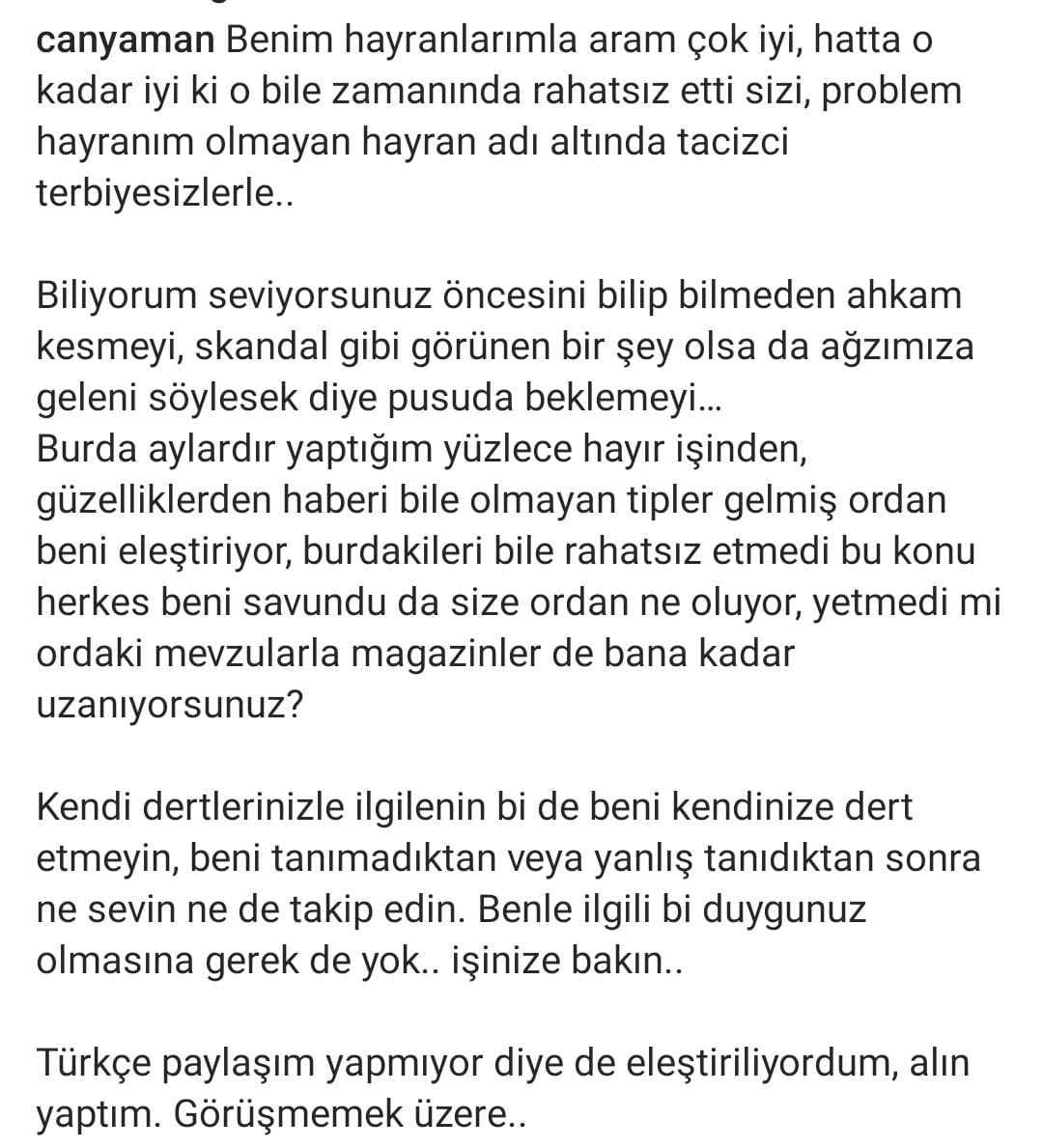 Burada aylardır yaptığım yüzlerce hayır işinden, güzelliklerden haberi bile olmayan tipler gelmiş oradan beni eleştiriyor, buradakileri bile rahatsız etmedi bu konu herkes beni savundu da size oradan ne oluyor, yetmedi mi oradaki mevzularla magazinler de bana kadar uzanıyorsunuz? Kendi dertlerinizle ilgilenin bir de beni kendinize dert etmeyin, beni tanımadıktan veya yanlış tanıdıktan sonra ne sevin ne de takip edin. Benle ilgili bir duygunuz olmasına gerek de yok. İşinize bakın. Türkçe paylaşım yapmıyor diye de eleştiriliyordum, alın yaptım. Görüşmemek üzere..." ifadelerini kullandı.