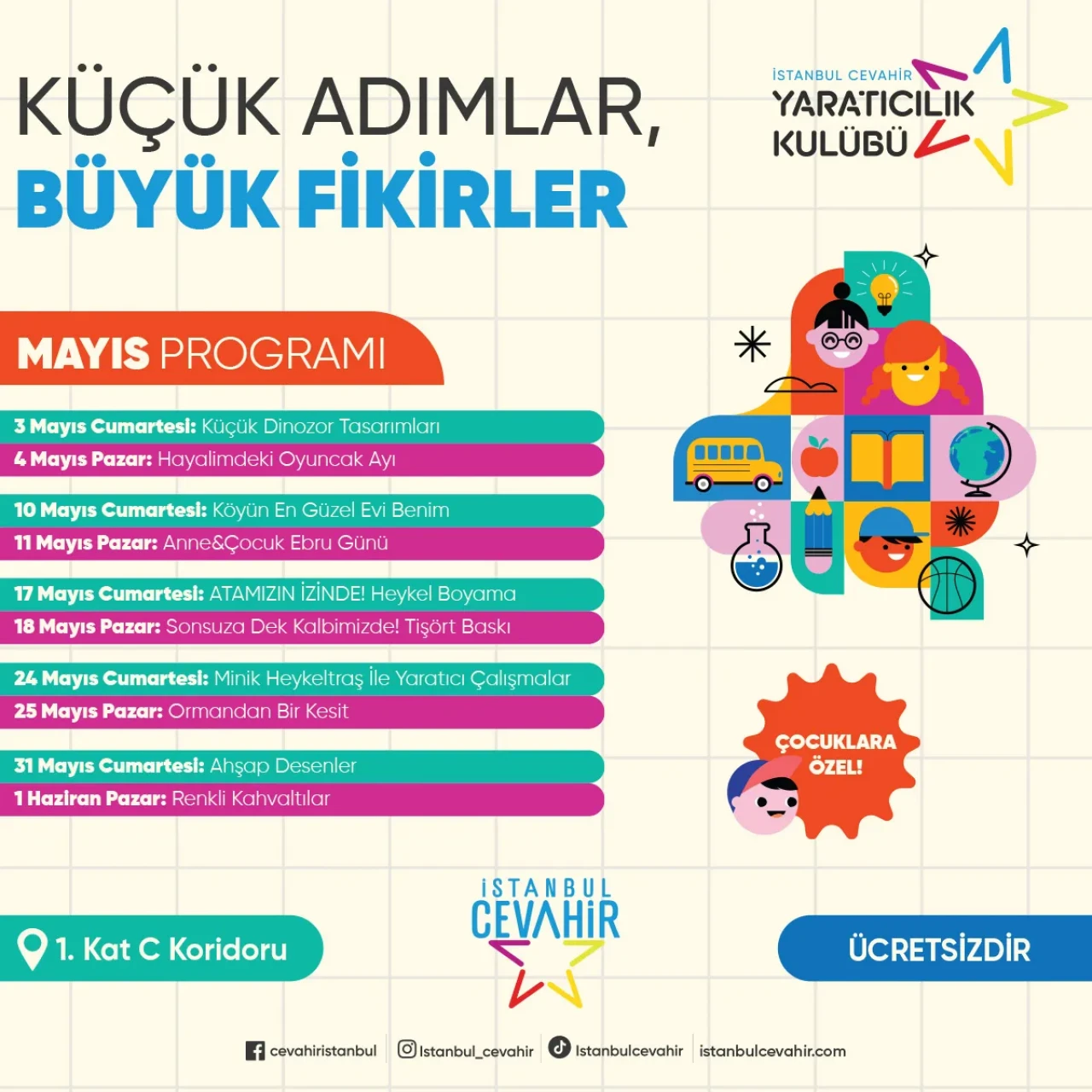 Türkiye’nin yerli ve milli markalarının buluşma noktası İstanbul Cevahir Alışveriş ve Eğlence Merkezi, geleceğin teminatı çocuklarımız için yeni nesil etkinliklere ev sahipliği yapmaya devam ediyor. “Yaratıcılık Kulübü” çatısı altında düzenlenen ücretsiz atölyeler, mayıs ayı boyunca minik ziyaretçilere hem eğlenceli hem de eğitici bir deneyim sunuyor.