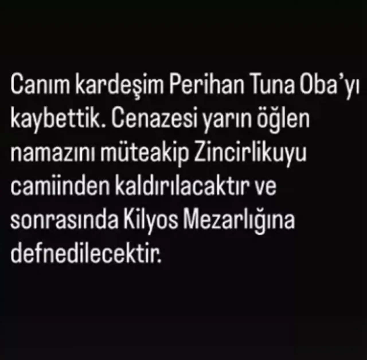 Cenazenin Zincirlikuyu Camii’nde kılınan öğle namazının ardından Kilyos Mezarlığı’na defnedileceğini belirten Tuna, takipçilerini bilgilendirdi.