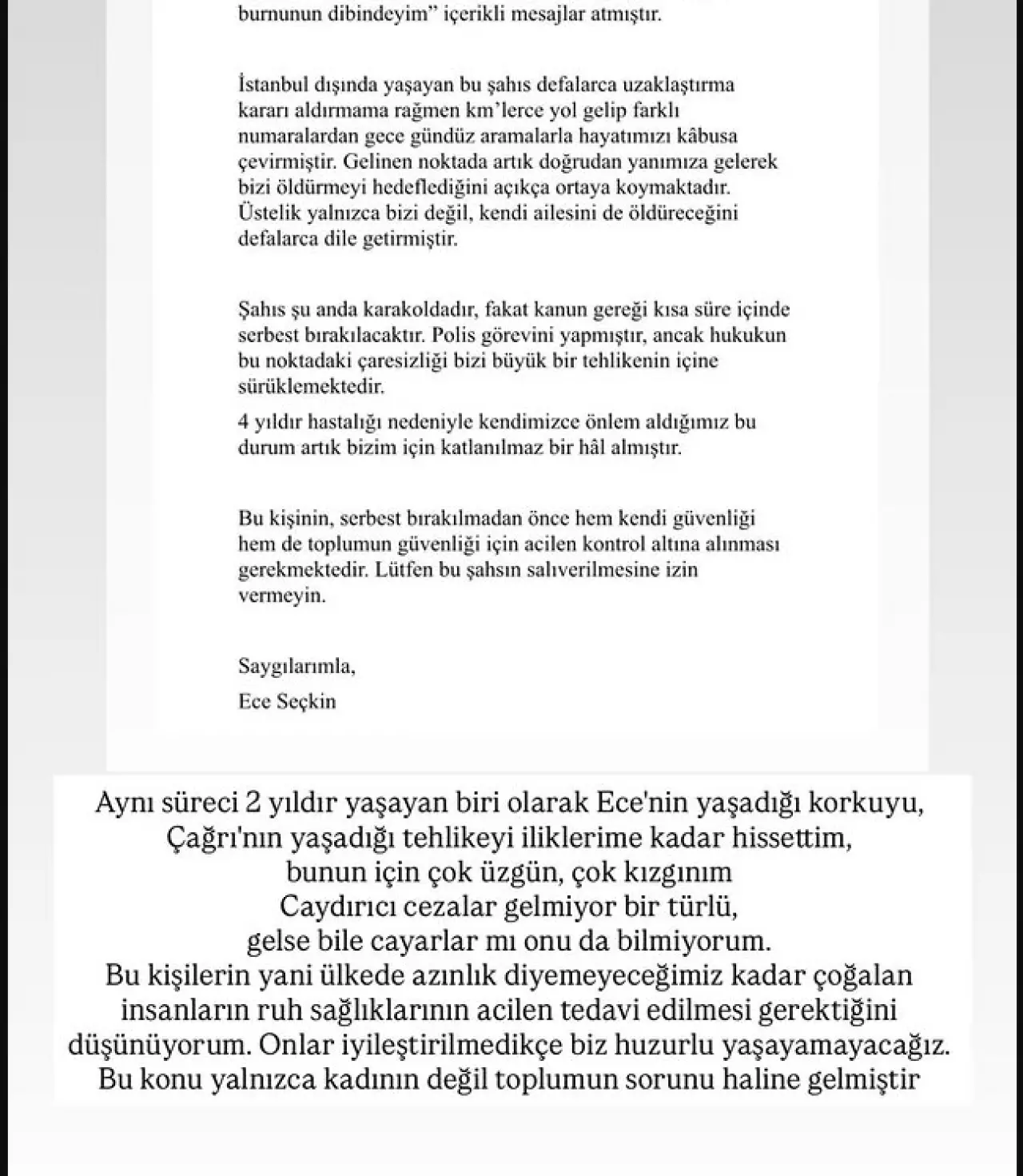 Uluğ, “Aynı süreci 2 yıldır yaşayan biri olarak Ece’nin korkusunu iliklerime kadar hissettim. Çok üzgünüm, çok kızgınım. Caydırıcı cezalar bir türlü gelmiyor” diyerek adalet boşluğuna dikkat çekti.