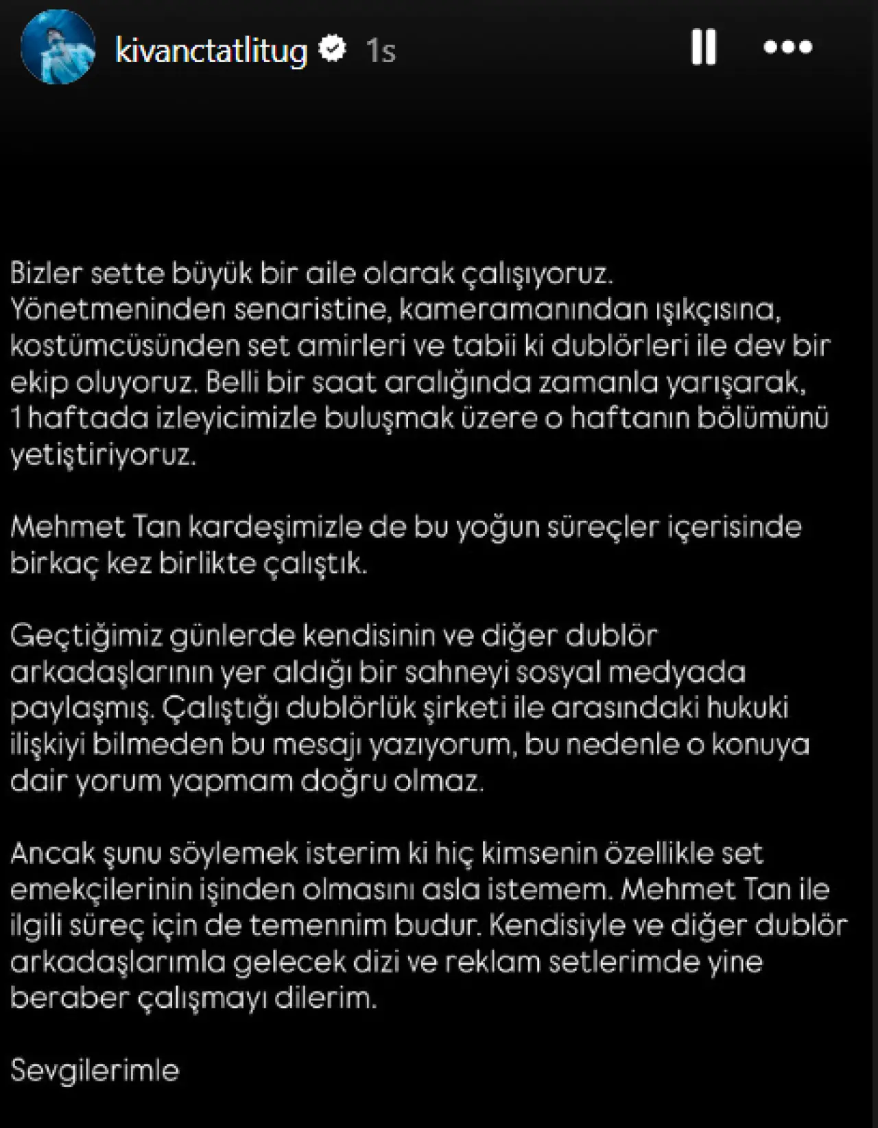 “Bizler sette büyük bir aile olarak çalışıyoruz. Yönetmeninden senaristine, kameramanından ışıkçısına, kostümcüsünden set amirlerine, tabii ki dublörlere kadar dev bir ekip oluyoruz. Hiç kimsenin, özellikle set emekçilerinin işinden olmasını asla istemem. Mehmet Tan ile ilgili süreç için de temennim budur. Gelecek dizi ve reklam setlerimde kendisiyle ve diğer dublör arkadaşlarımla yine çalışmayı dilerim.”