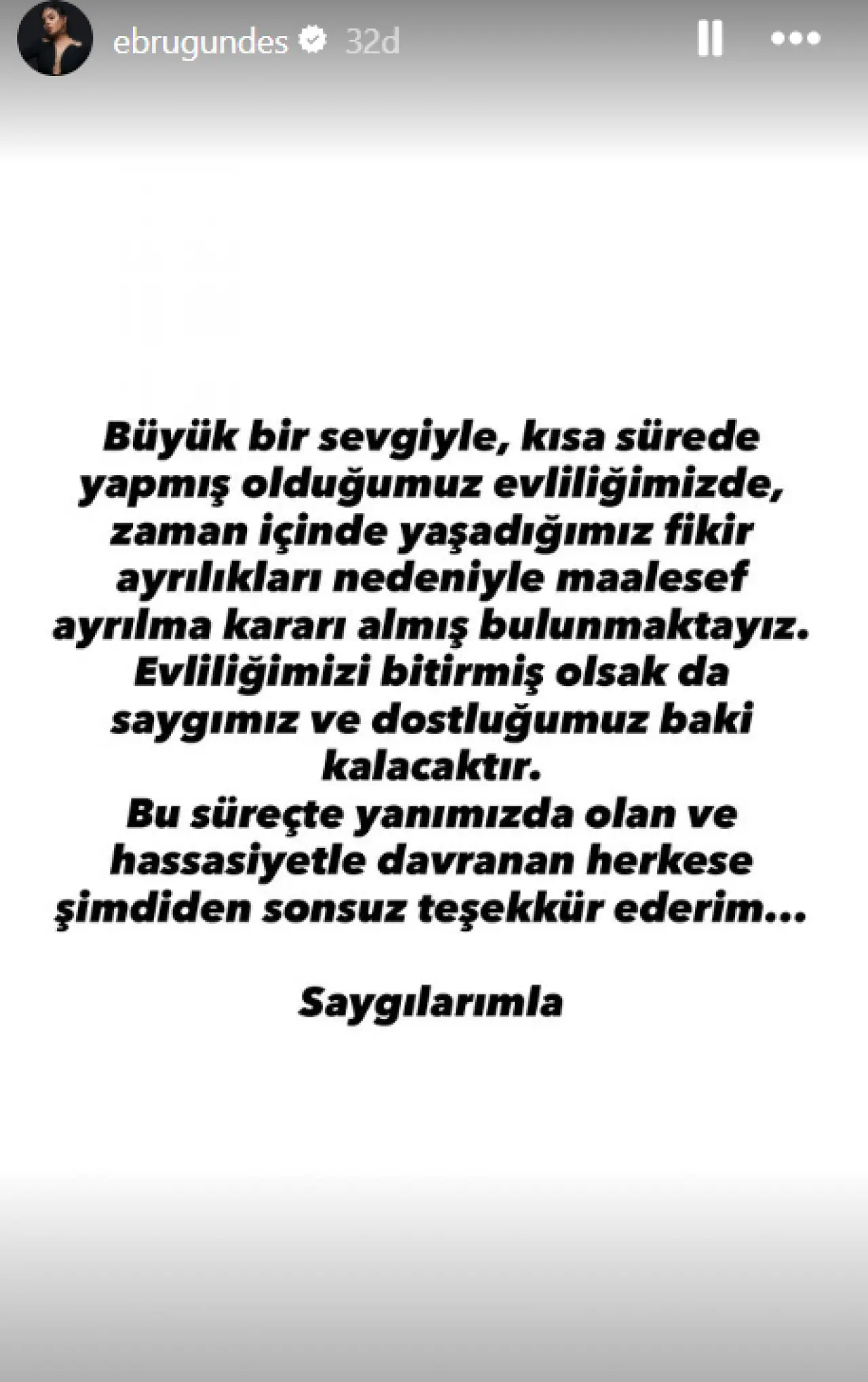 “Büyük bir sevgiyle, kısa sürede yapmış olduğumuz evliliğimizde zaman içinde yaşadığımız fikir ayrılıkları nedeniyle maalesef ayrılma kararı almış bulunmaktayız. Evliliğimizi bitirmiş olsak da saygımız ve dostluğumuz baki kalacaktır. Bu süreçte yanımızda olan ve hassasiyetle davranan herkese teşekkür ederim.”