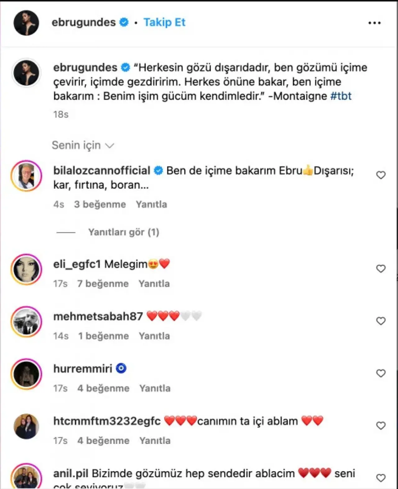 Ünlü sanatçı, Fransız filozof Montaigne’in bir sözünü alıntılayarak takipçileriyle paylaştı. Gündeş'in paylaşımında şu ifadeler yer aldı: