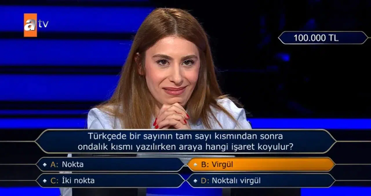 Yarışmacının karşısına çıkan soru oldukça net ancak bir o kadar da kafa karıştırıcıydı: “Türkçede bir sayının tam sayı kısmından sonra ondalık kısmı yazılırken araya hangi işaret koyulur?” Şıklar arasında; nokta, virgül, iki nokta ve noktalı virgül yer alıyordu. Günlük hayatta sıkça yapılan hatalar ve teknolojik cihazlardaki "nokta" kullanımı, edebiyat mezunu yarışmacının kafasını karıştırmaya yetti.
