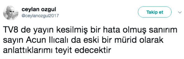 Özgül'ün Twitter hesabından yayınladığı bir mesajda "TV8'de yayın kesilmiş bir hata olmuş sanırım sayın Acun Ilıcalı da eski bir mürit olarak anlattıklarımı teyit edecektir" ifadelerini kullandı. Özgül'ün tweetti sosyal medyada bomba etkisi yarattı. Özgül, daha sonra bu tweetini sildi.