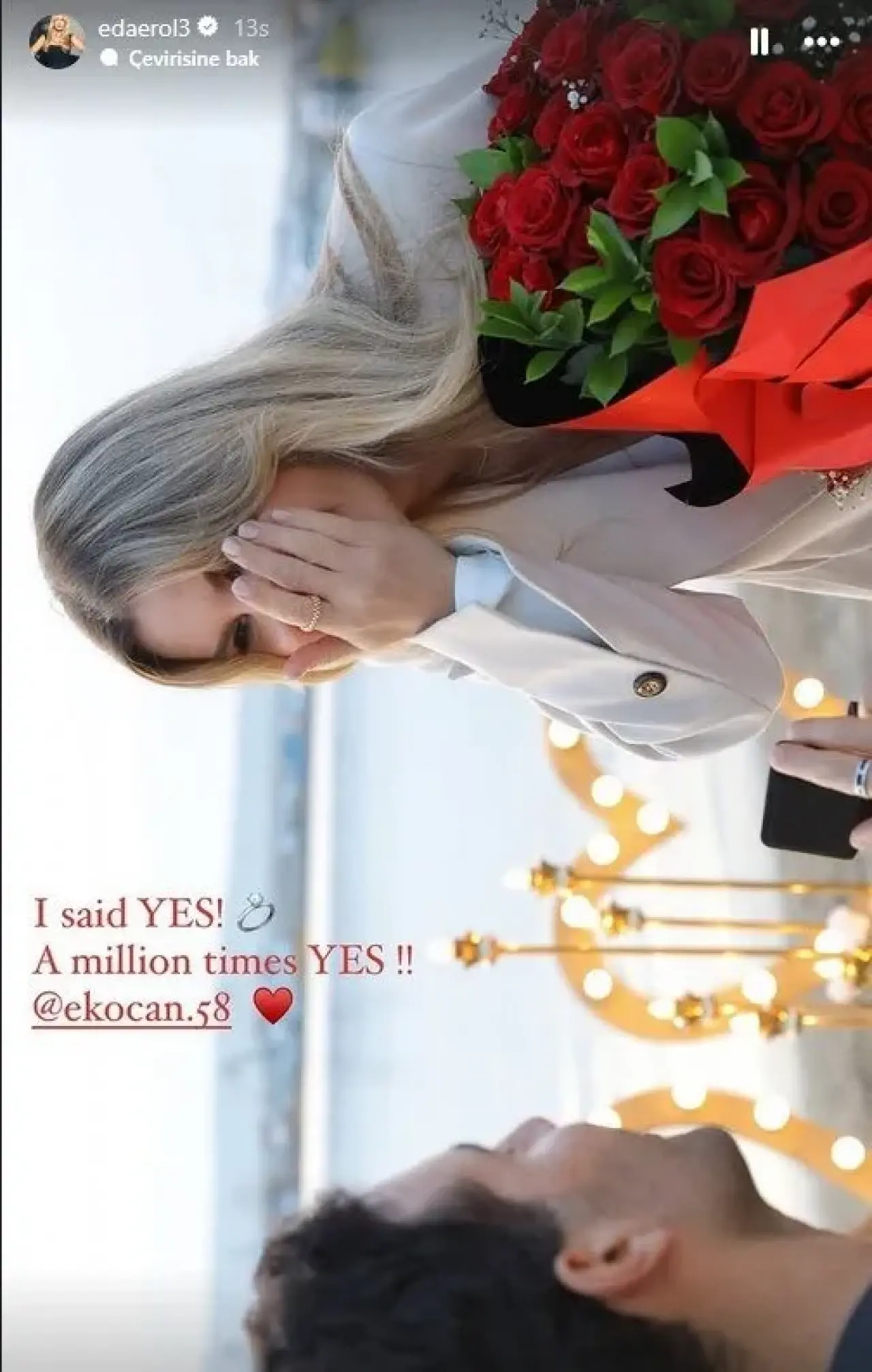39 yaşındaki Eda Erol, sosyal medya hesabından yaptığı paylaşımda, pilot sevgilisi Ekrem Karaçayır’ın evlilik teklifine “Milyon kez evet” yanıtını verdiğini duyurdu. Paylaşımına ise "Sonsuza dek aşkım" notunu ekleyerek duygularını takipçileriyle paylaştı.